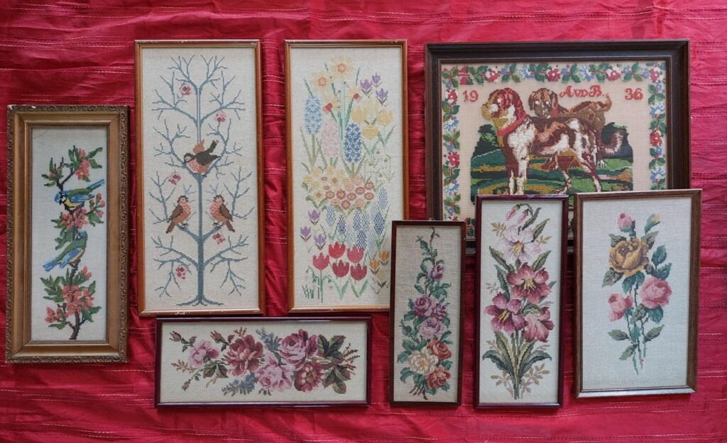 En vandaag besluit ik mijn verzameling ingelijste borduurwerken tevoorschijn te halen en er nieuwe foto’s van te maken. De meeste van deze borduurwerken heb ik in de loop der jaren wel eens op mijn blog laten zien. Vandaag nog eens.