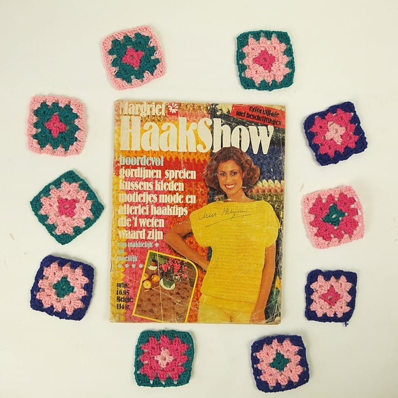Ik deed dat tenminste wel toen ik het doorbladerde. Pure nostalgie, bron van inspiratie, maar vooral die herkenning is zo leuk. Zo was ik een tijdje geleden wat Grannies aan het haken en nu zag ik dit plaatje in het tijdschrift: zelfde kleuren! Leuk bewijs dat ‘1977’ weer helemaal hip is. In onze tijd zijn er weer heel veel nieuwe haakboeken te koop, maar zo’n oud tijdschrift is voor liefhebbers toch wel zo leuk. In m’n shop laat ik nog meer bladzijden zien van dit leuke tijdschrift van…. Margriet!