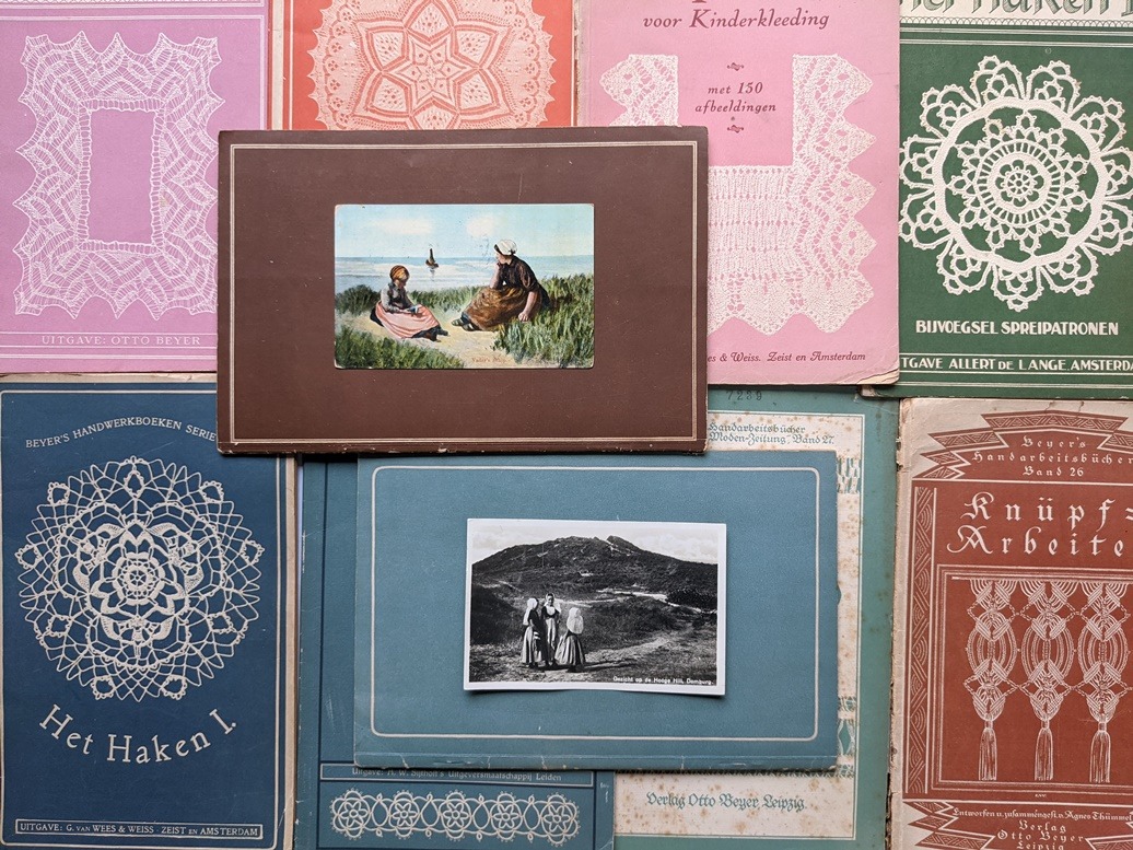 Niet iedereen zal het geld of de tijd hebben gehad om zich met die verfijnde handwerken bezig te houden, en de meisjes in de duinen waren waarschijnlijk gewoon aan het sokken breien. Veel meisjes moesten dagelijks een aantal pennen breien. Maar zulke kaarten geven toch iets weer van de sfeer van de tijd waarin deze handwerkboeken zijn verschenen. En deze oude boeken zijn nu weer geliefd vanwege hun mooie patronen.