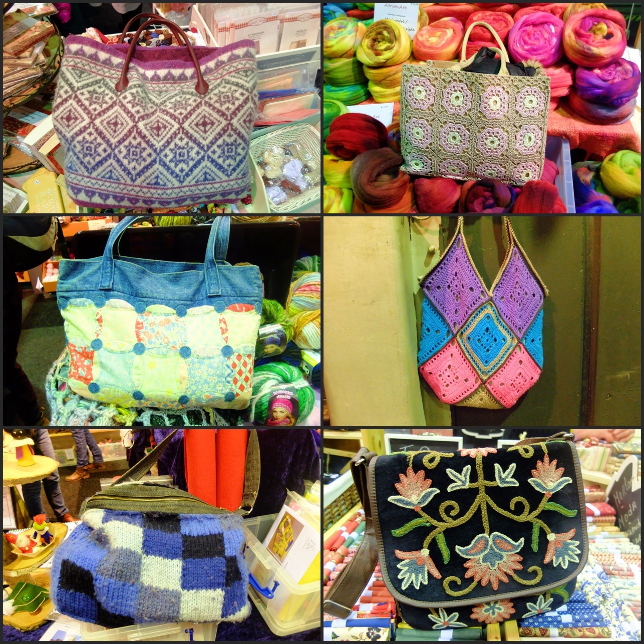 Sommige exposanten houden er niet van als je foto’s maakt van hun handel; anderen zouden het wel best vinden, maar ik heb het nergens gevraagd. Ik had een ander idee om verslag te doen van de handwerkbeurs: ik vroeg of ik wat tassen mocht fotograferen van bezoekers. Bijna iedereen was verbaasd dat ik het vroeg, maar ze vonden het ook leuk. Mijn gedachte is: laten zien hoe enorm veel creativiteit op zo’n beurs te zien is. Er waren ook veel vrouwen die prachtige zelfgebreide of gehaakte omslagdoeken, truien of vesten droegen. Al die zelfgemaakte kleding en tassen droegen bij aan het algehele gevoel op zo’n beurs: blij zijn met zoveel mooie dingen om ons heen en een gevoel van herkenning dat we allemaal van handwerk houden. Ik heb genoten van het praatjes-maken (want je komt heel makkelijk met elkaar in gesprek) en van het kijken.