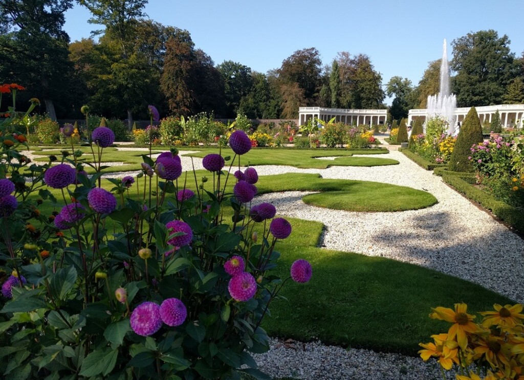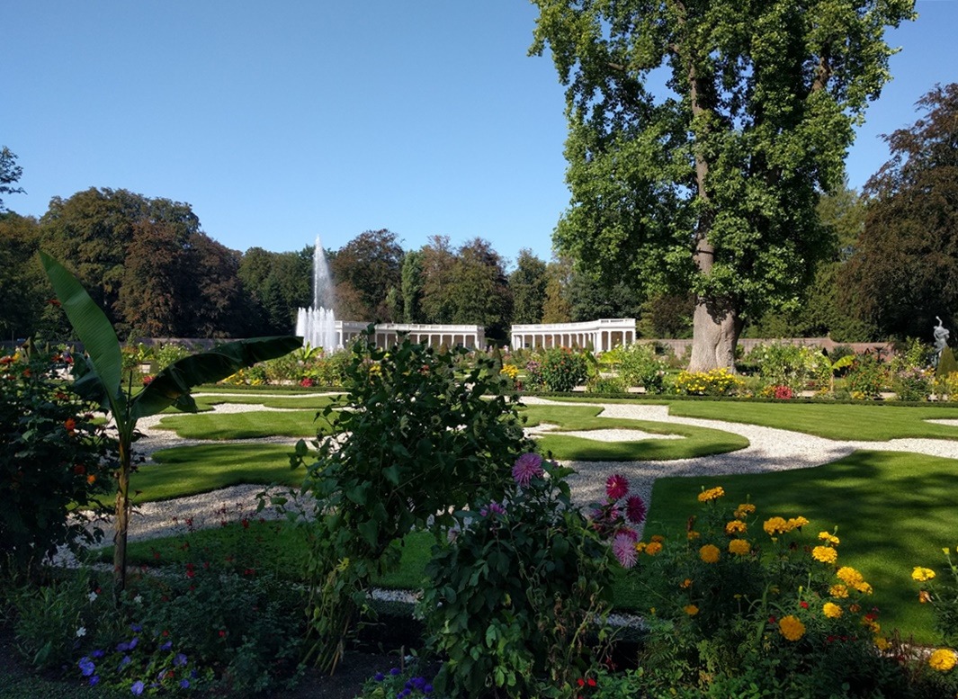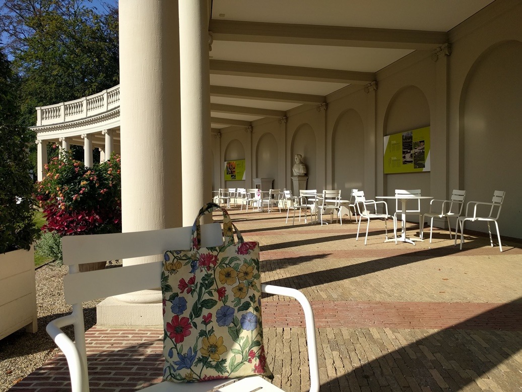 Evenwicht in schoonheid in een eeuwenoude tuin. En evenwicht in contrasten van ronde en strakke lijnen, felle en fletsere kleuren. Achterin de tuin van paleis het Loo lonkt de witte colonnade. De vroegere plek van adellijke lieden is nu vrij toegankelijk voor mensen die zin hebben om een prachtige herfstuurtje door te brengen aan een tafeltje onder een schaduwdak.