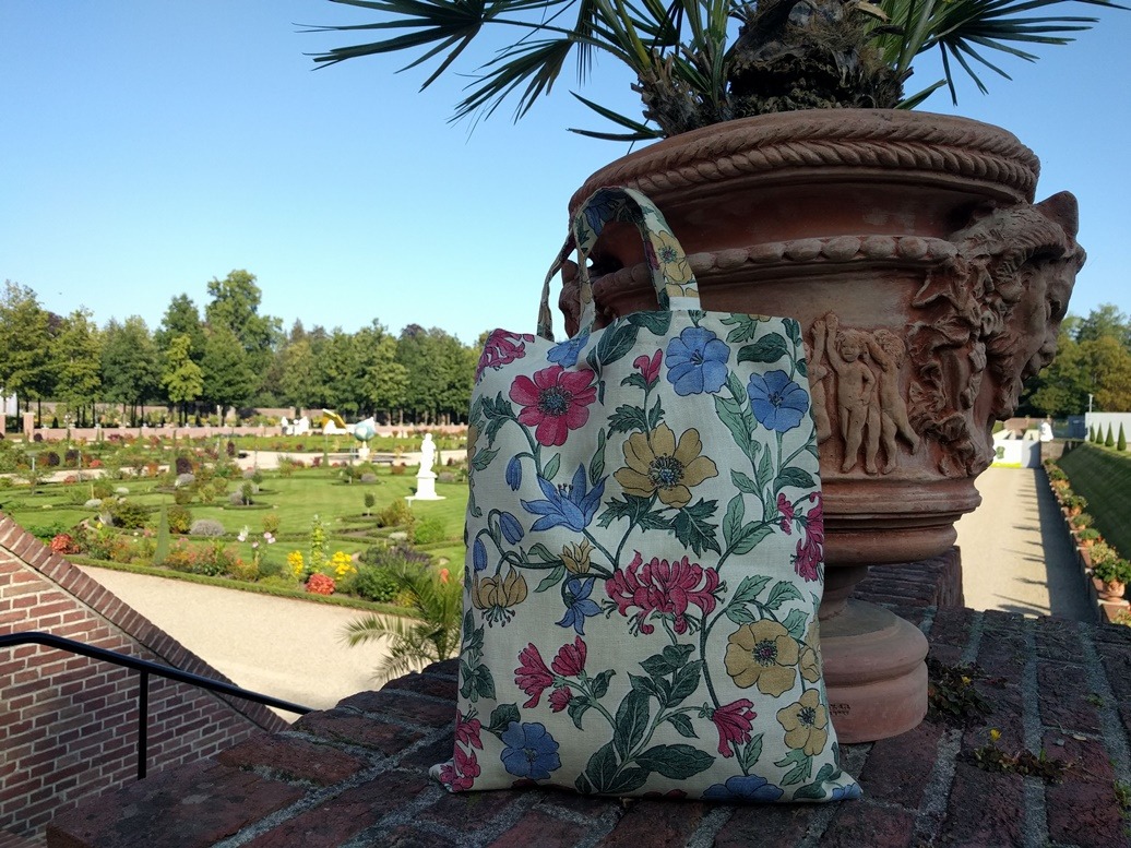 Dus daar zat ik dan een tijdje. Ik had wat meegenomen om te lezen en om te drinken en om te borduren en dat zat in mijn zelfgemaakte tas. Deze maakte ik (twintig jaar geleden al) van een vrolijk ‘cretonnetje’. Vroeger was deze stof zo bekend dat het bijvoeglijk naamwoord als zelfstandig naamwoord werd gebruikt. Het is sterke katoenen stof, die meestal voor gordijnen of meubelkleding werd gebruikt. Kenmerkend zijn de grote bloemen op de iets grovere geweven stof.