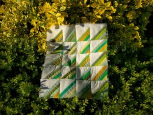 Eerder combineerde ik m’n strookjes groene stof met zwarte driehoekjes, maar ik probeerde het ook eens in combinatie met witte driehoekjes.