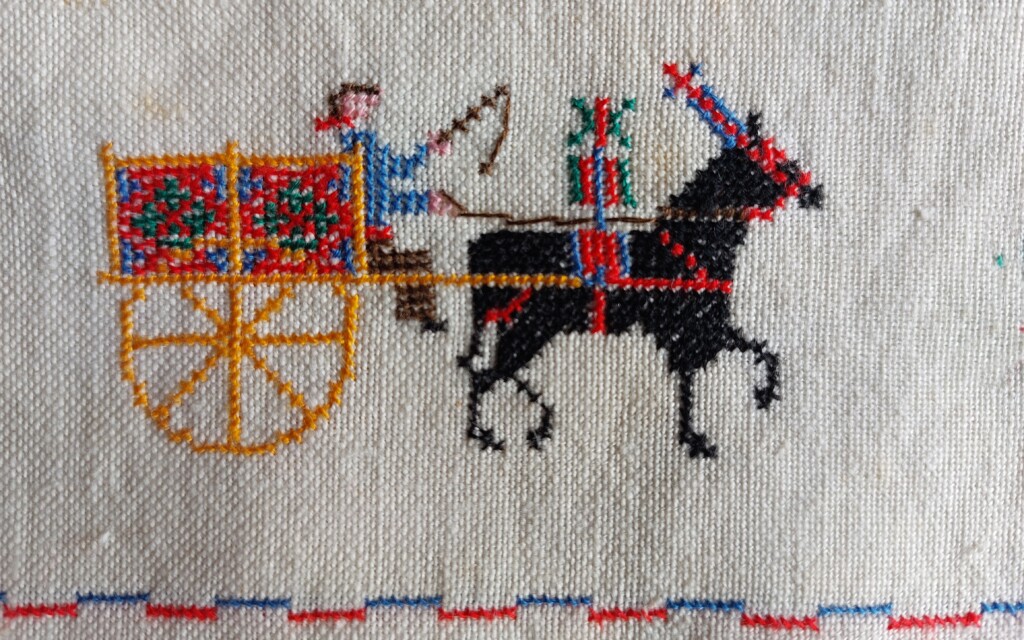 En het is het verhaal van hoe er werd geborduurd met hele fijne kruisjes op handgeweven linnen, wat vaak op de boerderijen werd geweven. Al het huishoudlinnen moest vroeger worden gemerkt. En toen dat later niet meer nodig was? Misschien heeft toen iemand op latere leeftijd zin gehad om nog eens op zulk linnen te borduren, opnieuw met die hele fijne kruisjes. Een merkteken was niet meer nodig, maar nu was het tijd voor een slabbetje voor een kleinkind.