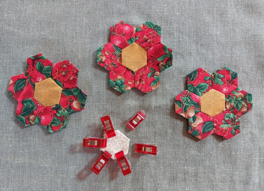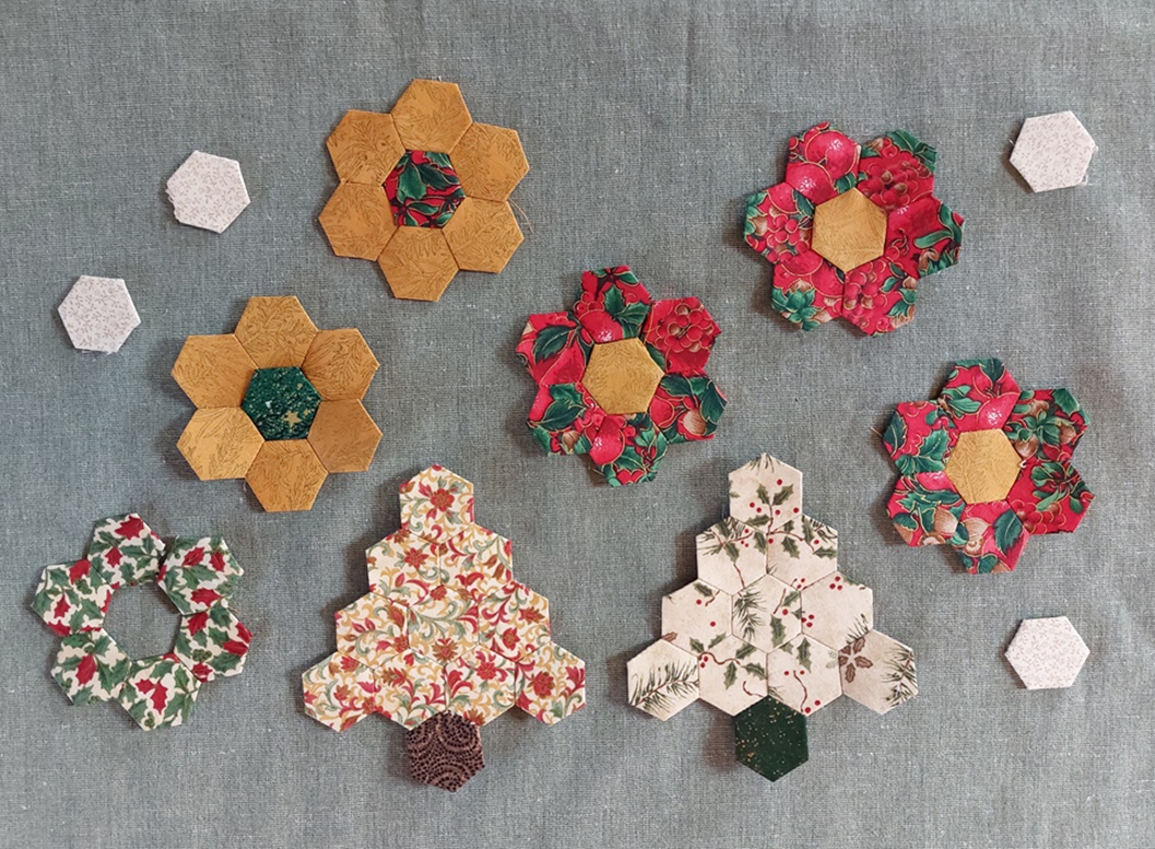 In een doosje vond ik wat onafgemaakte hexagonnen boompjes en bloemetjes. Ik besloot er een paar af te maken. De boompjes hing ik in de kerstboom en met de bloemetjes ging ik vanmorgen nog even bezig. Want dan kan ik met deze foto een link plaatsen naar Annelies van Quilt & Siggies. Zij liet zien hoe ze na een jaar bezig te zijn geweest met hexagonnen nu een heel grote ‘mysterie quilt’ heeft afgemaakt.