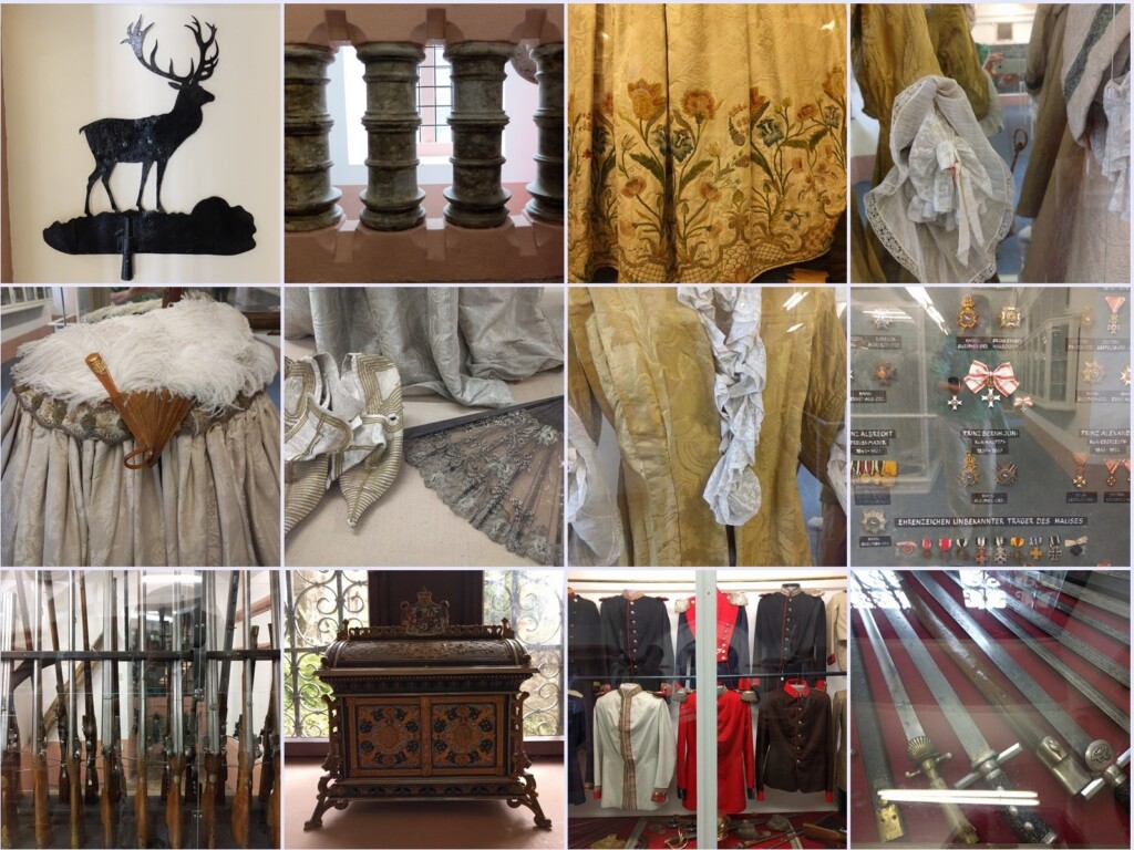 We bezochten de tentoonstelling binnen het kasteel en gelijk viel de scherpe scheiding tussen de mannenwereld en de vrouwenwereld op. Voor de mannen wapentuig en indrukwekkende uniformen met onderscheidende medailles. Voor de vrouwen prachtige kleding, rijk geborduurd en afgezet met weelderige kant.