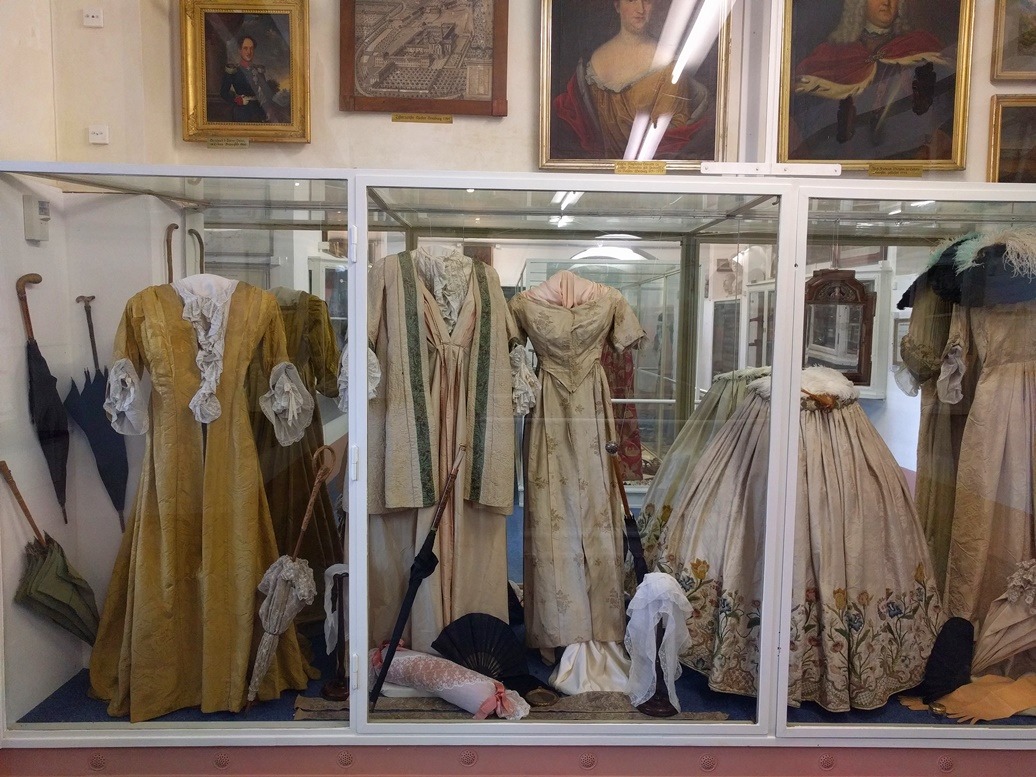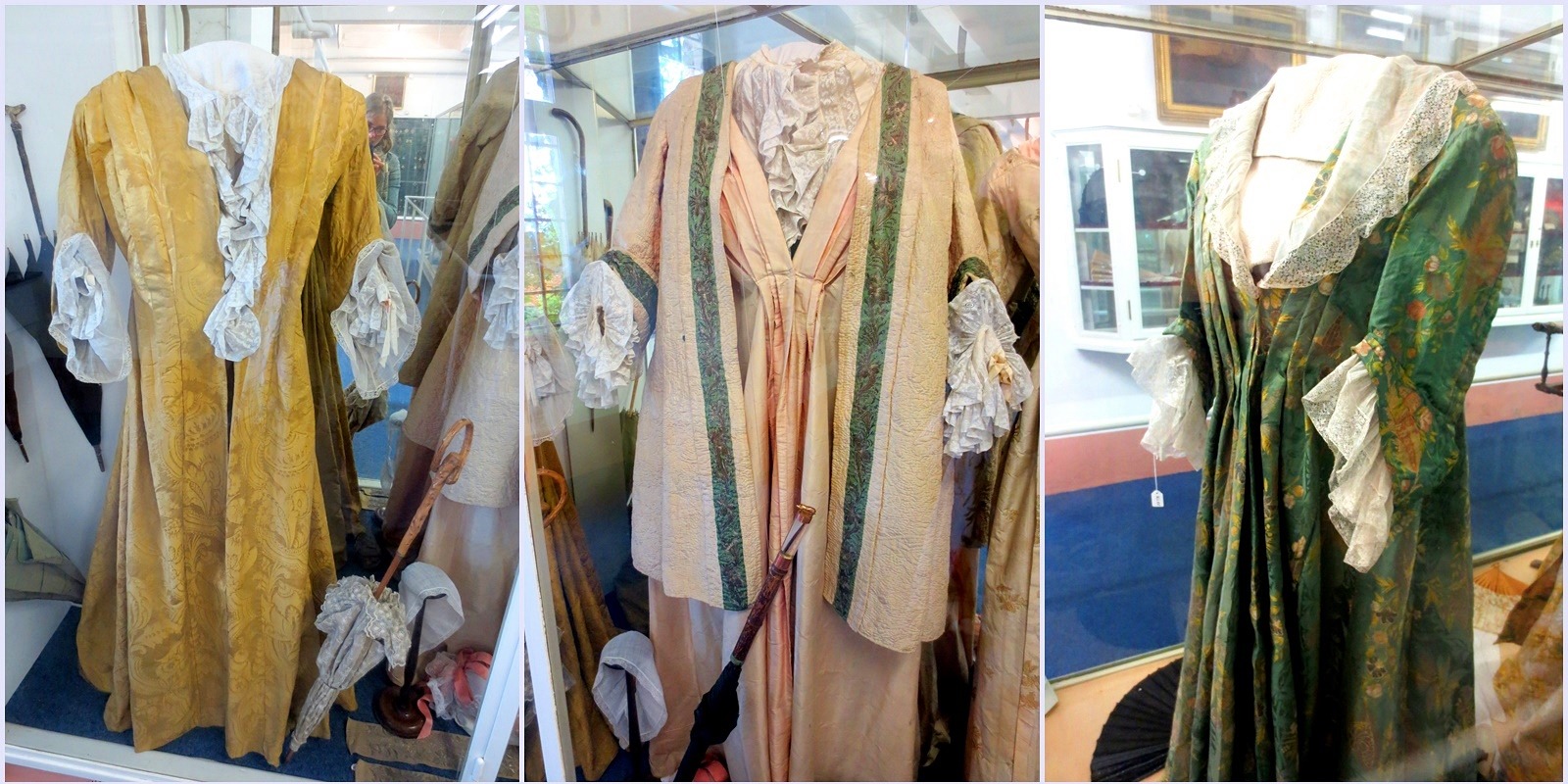 In de vitrine hingen oude jurken en in deze entourage van de eeuwenoude kasteelmuren kon je er makkelijk een voorstelling van maken hoe dat voor de draagsters van die jurken moet zijn geweest. Wachten totdat de mannen we terugkwamen van een veldslag?