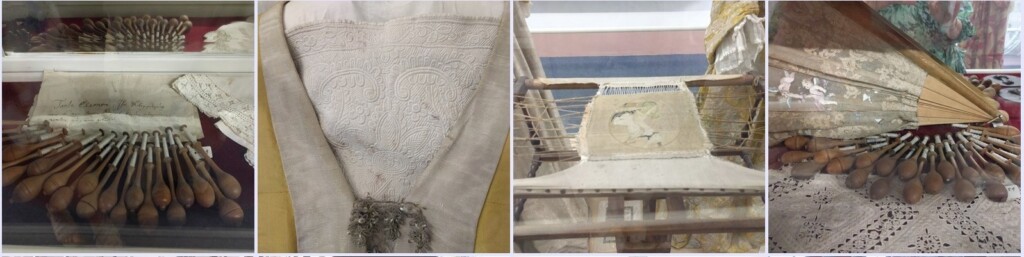 In een andere vitrine stond ik een tijdje stil bij een borduurraam en de kantklosjes waarmee de uren binnen het kasteel werden gevuld.