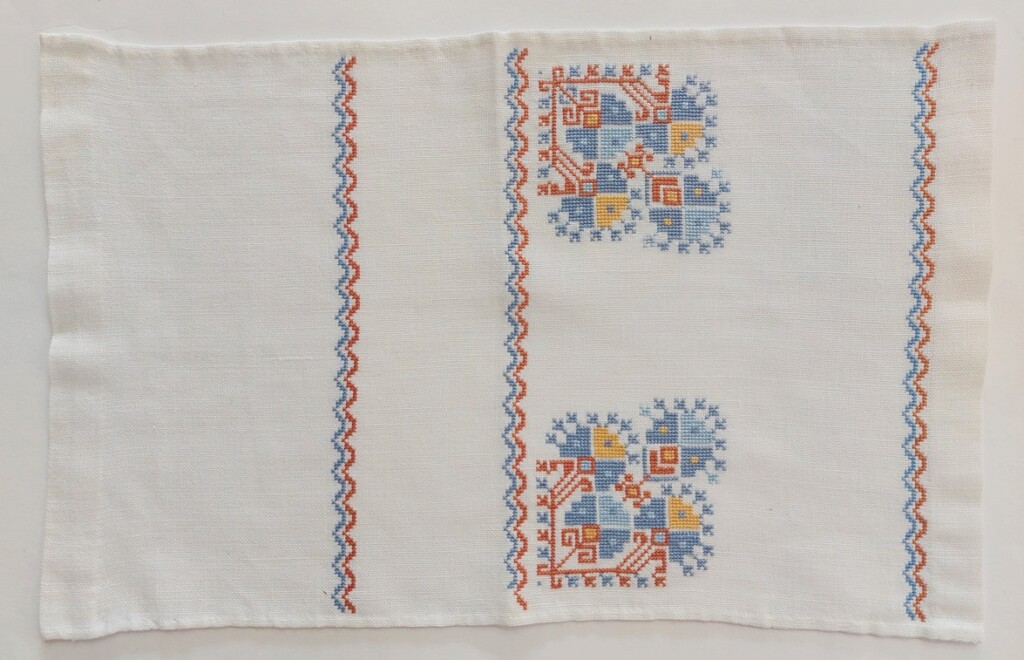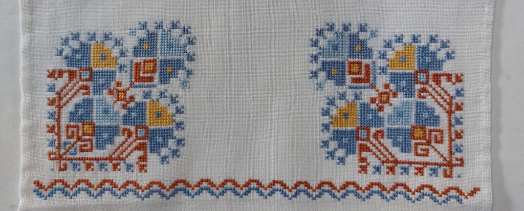 In de zomerperiode laat ik elke dag een handwerkje zien en dat zijn voornamelijk borduurwerkjes. Wat is er veel geborduurd! En wat zijn die oude borduurwerkjes vaak nog leuk om te zien! Elk borduurwerkje is een combinatie van stof waarop geborduurd wordt, van kleuren die iemand uitzocht, en een patroon wat iemand aanzette tot dat ene bepaalde borduurwerk. Soms is er nog wel aan af te lezen waarom iemand voor een bepaald patroon en dus eindresultaat koos. En soms ook niet en dan vraag ik me af: wat zou de borduurster hiermee hebben gewild? Dit lapje heeft een wat aparte indeling en ik zie niet direct waarvoor het was bedoeld.