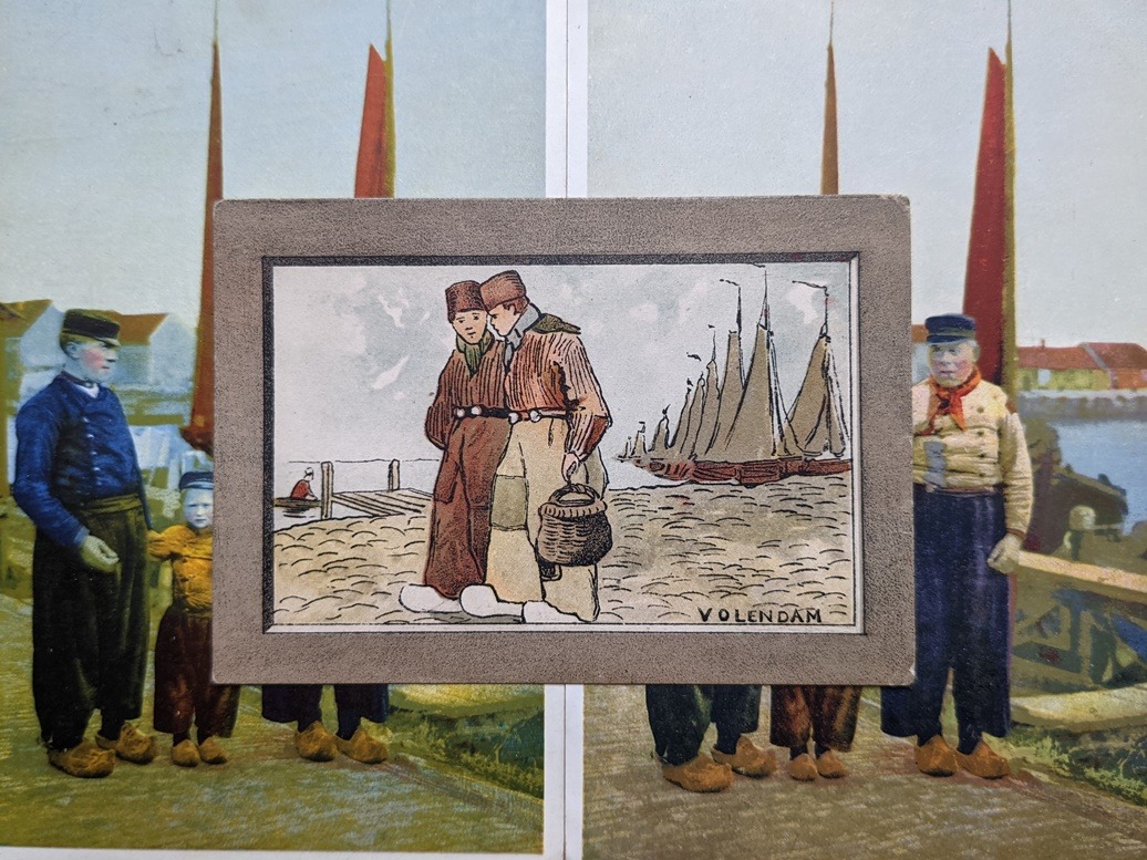 Ansichtkaarten met afbeeldingen van Marker- of Volendammer streekdracht waren voor de oorlog populair. Dus er zullen er heel wat van zijn gedrukt en verstuurd, maar toch komt het nou ook weer niet zo heel vaak voor om twee dezelfde tegen te komen. Ik heb ze in m’n shop geplaatst.