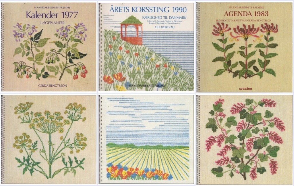 De kalenders van de Haandarbejdets Fremme zijn tijdloos. Gelukkig is bij deze oude kalenders (of agenda’s) het schrijfgedeelte niet gebruikt zodat alle aandacht voor de mooie Deense borduurwerken is. Gerda Bengtsson gaf heel mooi de essentie van geneeskrachtige kruiden weer (Kalender 1977) en van bloeiende takken (Agenda 1983). Deze agenda’s werden ook onder Nederlandse handwerkliefhebbers geliefd, omdat Ariadne deze kalenders verspreidde. Het is leuk om nu ook een andere kalender van de Haandarbejdets Fremme te laten zien, met ontwerpen van een architect. In de kalender van 1990 is te zien hoe hij 12 keer het Deense landschap weergaf. Ook hier weer: door het weglaten van details is een krachtig ontwerp neergezet.