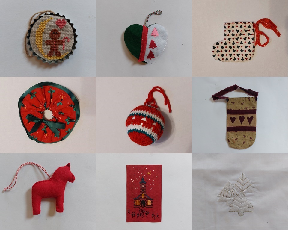 Tussen de kleine kerst-dingetjes vond ik ook een klein kerstkussentje. Dat vond ik niet leuk genoeg om te laten zien. Daarom van alle kleine kerstfrutsels een collage gemaakt. Al die oude ‘dingetjes’ geven weer hoe het al heel lang leuk is geweest om voor kerst ‘iets’ te maken! Ideeën zijn er altijd meer dan genoeg, en het zien wat anderen in vroegere decennia hebben gemaakt geeft misschien inspiratie. En waarschijnlijk ook een glimlach van herkenning.