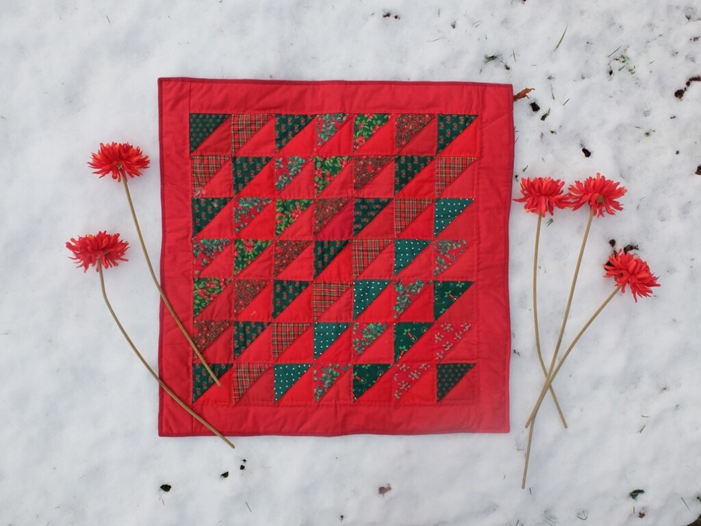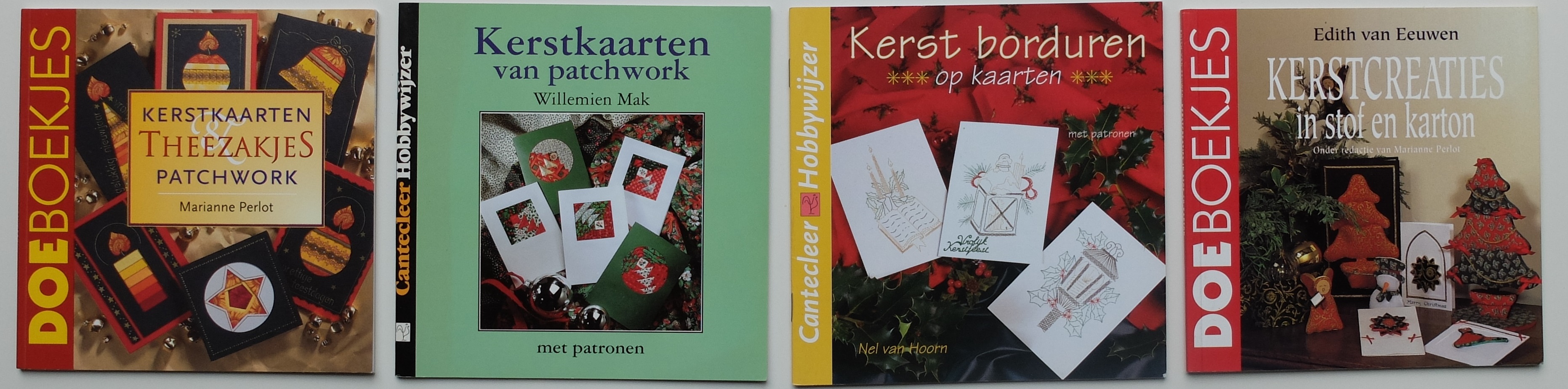 Deze foto maakte ik vanmorgen, en het quiltje maakte ik een paar jaar geleden. Ik gebruikte al die kleine restjes die nog over waren van de jaren negentig, en juist dat puzzelen om genoeg te hebben maakte het leuk om dit te maken. De boekjes hieronder komen ook uit die negentiger jaren. We waren er vroeger dol op, op die kleine boekjes en op alle leuke tips en mogelijkheden om Kerstkaarten te maken van theezakjes-patchwork en Kerstkaarten van patchwork, en Kerst borduren op kaarten en Kerstcreaties in stof en karton.