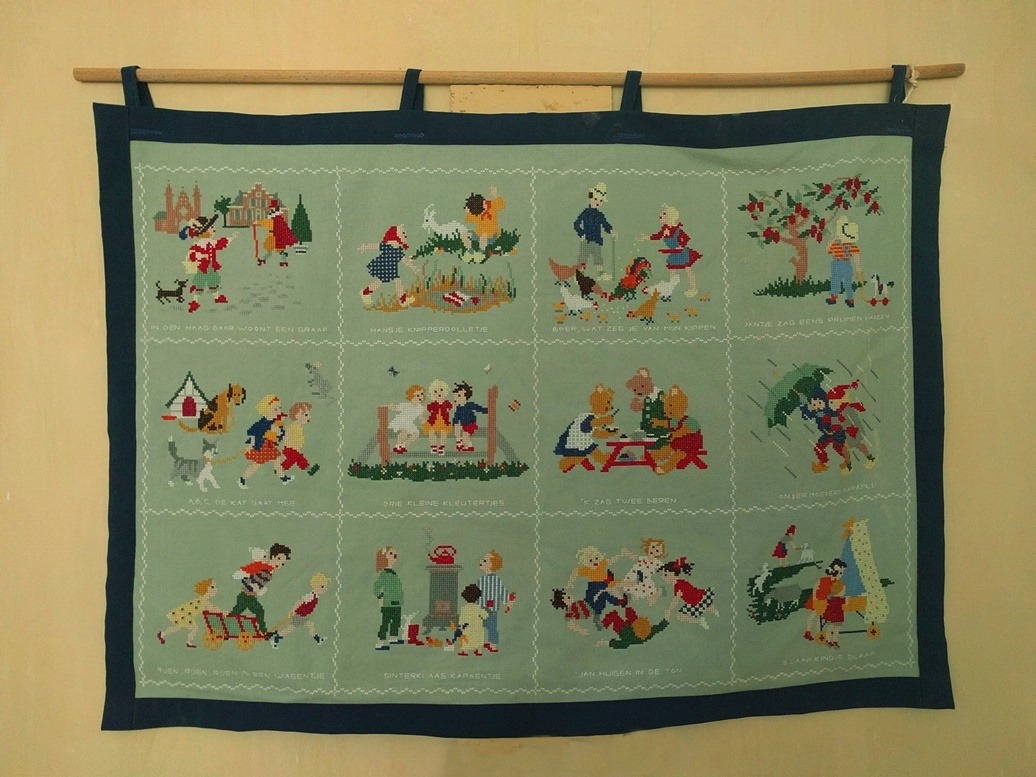 In het appartement waar ik begin deze week was, hing een wandkleed met deze kinderversjes. M’n zus had het als onafgewerkt borduurwerk gekocht en er zelf een rand, achterkant en lussen aangemaakt, zodat het een wandkleed werd. Zo kunnen weer nieuwe kleine kindertjes naar deze hele oude kinderversjes kijken en is er altijd wel iemand van de vorige generatie die in het voorbijgaan zo’n versje even zingt. Zo blijven die hele oude versjes nòg langer hangen in het collectieve geheugen.