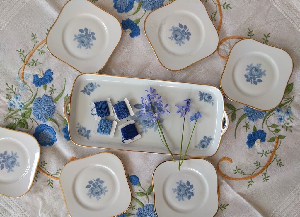 Bij het opruimen van een huis moet je veel beslissingen nemen, en grofweg zijn die te verdelen in: bewaren of wegdoen? Een mooi geborduurd kleedje had ik in eerste instantie laten liggen maar nu bleek dat niemand anders het wilde. Het lag al in de zak met spullen om weg te doen, maar daar heb ik het toch maar weer uitgehaald. Mooi die lichtblauwe bloemetjes (en m’n moeder hield van lichtblauw). Vroeger was het gebruikelijk om de mooie spullen tevoorschijn te halen voor visite en dan zorgde je dat je een mooi kleedje klaar had liggen, liefst bijpassend bij een servies. En kennelijk komt dat nu ook weer in de mode, want ik zag bij de Aldi borduurpakketten om ook weer zulke kleedjes te borduren in platsteek. De stof is dan voorbedrukt met de omtrek van de bloemetjes (dat gaat er later uit bij het wassen) en met naast elkaar liggende steken worden de motieven opgevuld. Wat leuk dat het borduren van zulke kleedjes ook weer terug is van weggeweest.