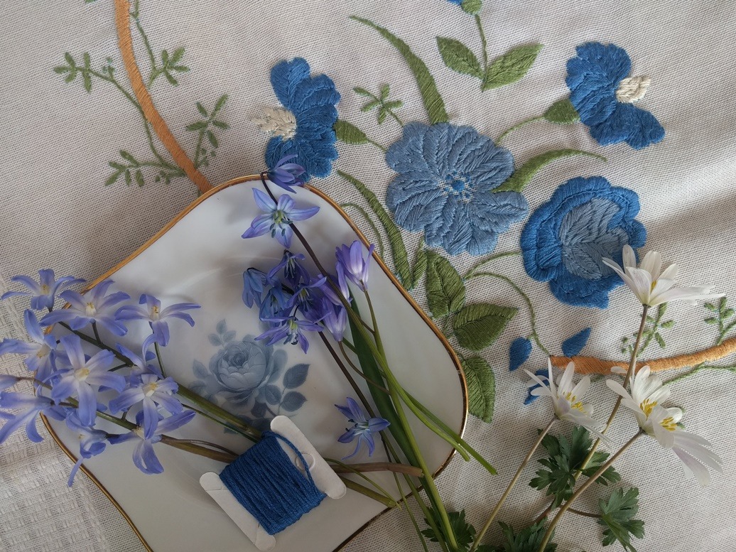 Maar ik hoef dus niet te borduren: dit lichtblauwe kleedje ligt al klaar. Ik keek nog eens goed naar de blauwe bloemetjes waar ik vorige week een flower-fairy tussen legde. Ik dacht dat ze even was neergestreken tussen de Scilla’s, maar het bleek Sneeuwroem te zijn. Nu zag ik dat ze door elkaar heen waren gegroeid en dat de Scilla-klokjes in de minderheid waren geraakt. Maar ze waren er nog wel. Daar ga ik nog een paar bolletjes van uitgraven. Genoeg te doen weer vandaag!