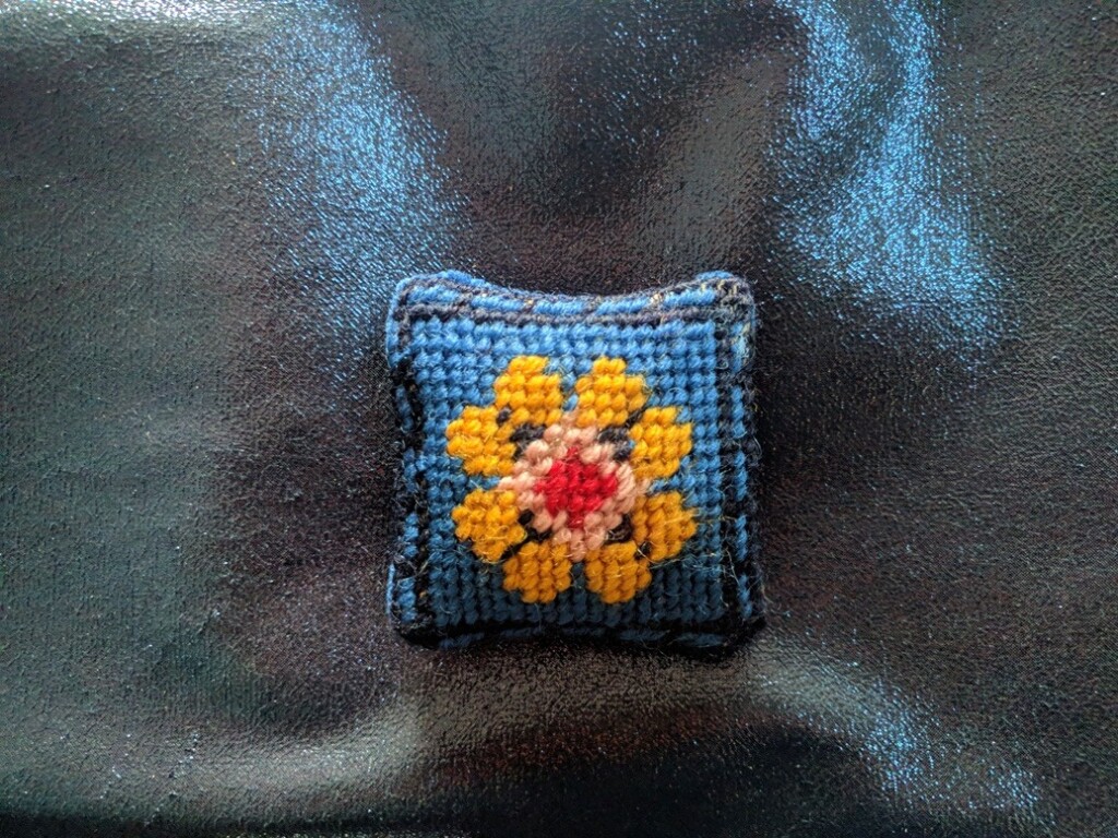 Een week lang haalde ik van alles tevoorschijn in mijn huis, want ik had het rijk alleen en kon alles laten liggen waar het mij uitkwam. Ik wilde van alles doen en kon de zeven dagen makkelijk tien keer vullen. Naar lessen en lezingen, naar drie concerten, in mijn eentje uit eten, bezoek ontvangen en afleggen, en dan ook nog al die dozen met spullen uitzoeken. Maar ik wou eigenlijk óók nog de naaimachine op tafel zetten en dan een week lang alles afmaken wat al lange tijd ligt. Wat niet kan natuurlijk. Ik moest keuzes maken. En ik koos voor het uitgaan en het uitzoeken. De naaimachine stond wel even op tafel, maar ik deed er niks mee. Slechts één klein kussentje veranderde van staat: van 25 jaar onafgewerkt naar een schattig klein kussentje. Echt waar, vijf-en-twintig jaar geleden geborduurd, toen wilde ik eens wat tapisserie uitproberen. En nu dus eindelijk afgewerkt!