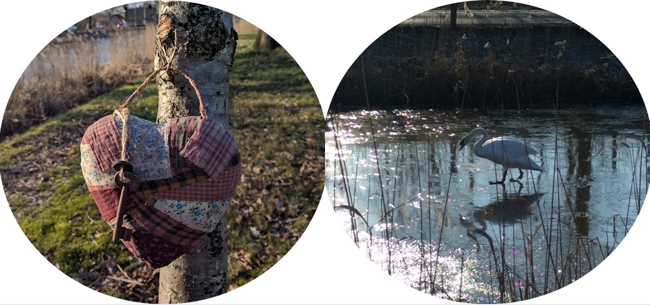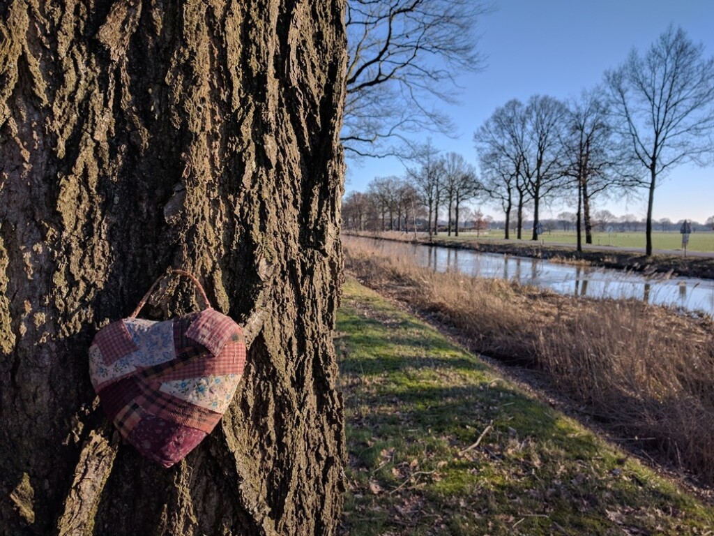 het eerste, als ik op de terugweg ben) is nieuw voor mij, dat heb ik nog niet zo vaak gereden. Ik had gezien dat daar een bord stond met ‘kringloop’ en had nu wel tijd om daar eens een kijkje te nemen. Ik scharrelde wat rond in een grote koude hal waar de radio keihard aanstond. “Ga vooral niet het natuur-ijs op want het laagje is nog veel te dun!” schalde het door de ruimte. Iedereen is bezig met de vraag of er wel of niet geschaatst kan worden. Ik vond een patchwork-hart op een tafel met allemaal harten, en een boekje Kleine toepassingen in patchwork. Niet veel, maar met dat hart kon ik wel wat, dus rekende ik het af. Toen nog die lange kanaal-weg, maar dat ging me te snel dit keer. Het was nog zùlk prachtig weer, daar wilde ik nog even van genieten. Dus ging ik een zijweggetje in om nog een kwartier buiten te zijn. Het hartje kon wel even aan de boom, je moet toch wat te doen hebben als je daar zo in de kou staat.