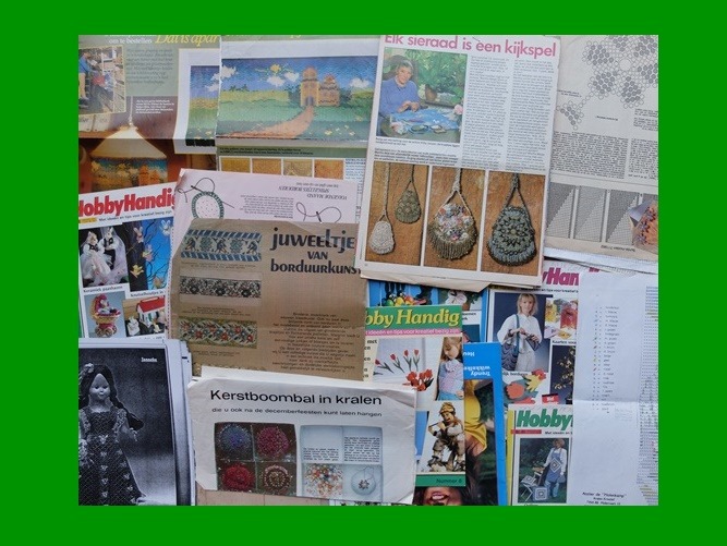 Wie een bepaalde hobby heeft, komt vaak meer ideeën tegen dan je op dat moment kunt uitvoeren. Veel hobbyisten lossen dat op door mooie of interessante patronen uit tijdschriften te bewaren in een apart mapje. Het dat-wil-ik-ook-nog-eens-maken-mapje. Tussen de boeken die ik verzamel zitten soms ook wat van die oude paperassen. Zoals een stapeltje met patronen over Kantklossen en patronen over Kralen. En wat lesmateriaal over een workshop Kleur.