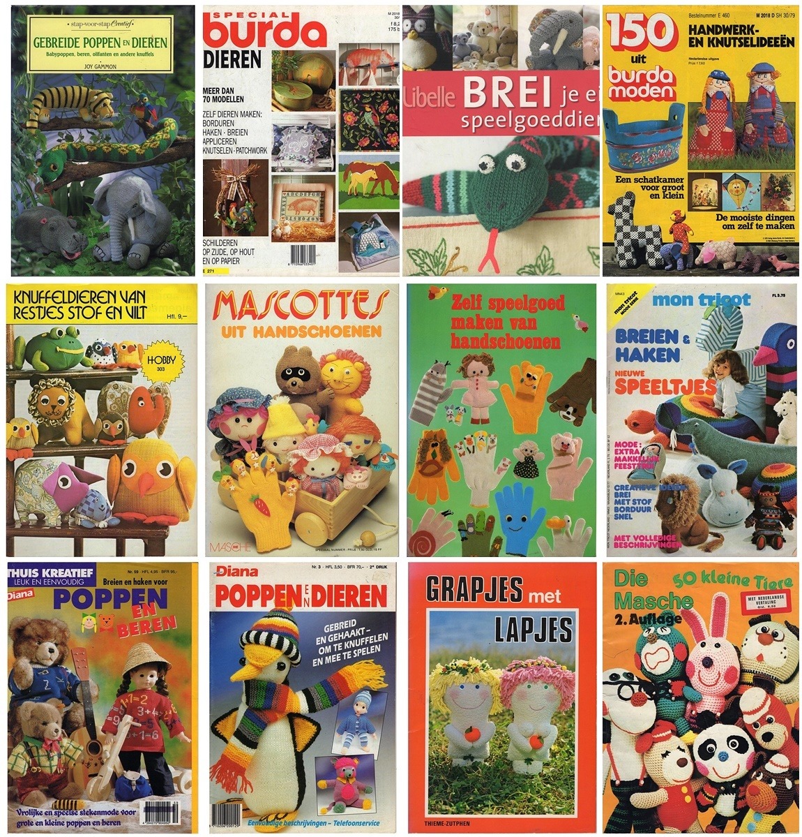 Het maken van knuffeldieren en poppen is van alle tijden, maar er zijn periodes dat het nòg meer hip is dan anders. In de tijd dat deze oude boeken en tijdschriften werden uitgegeven was het rage om poppen en knuffeldieren te maken en daarvoor waren leuke en gekke en bonte boeken en tijdschriften in omloop. En die zijn nu ook weer leuk en hip en bruikbaar!