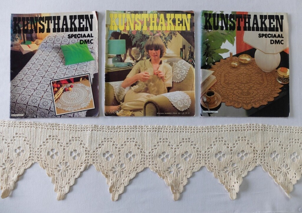 In de tijdschriften voor Kunsthaken staan veel mooie en ook wat grotere projecten om het hele huis vol te hangen met haakwerkjes. De puntgordijntjes staan er niet in, maar wel heel veel andere gordijnen, spreien en kleedjes. Er zijn denk ik een stuk of zes van deze tijdschriften verschenen in deze Kunsthaken-serie en het zijn allemaal mooie (oude) uitgaven.