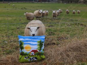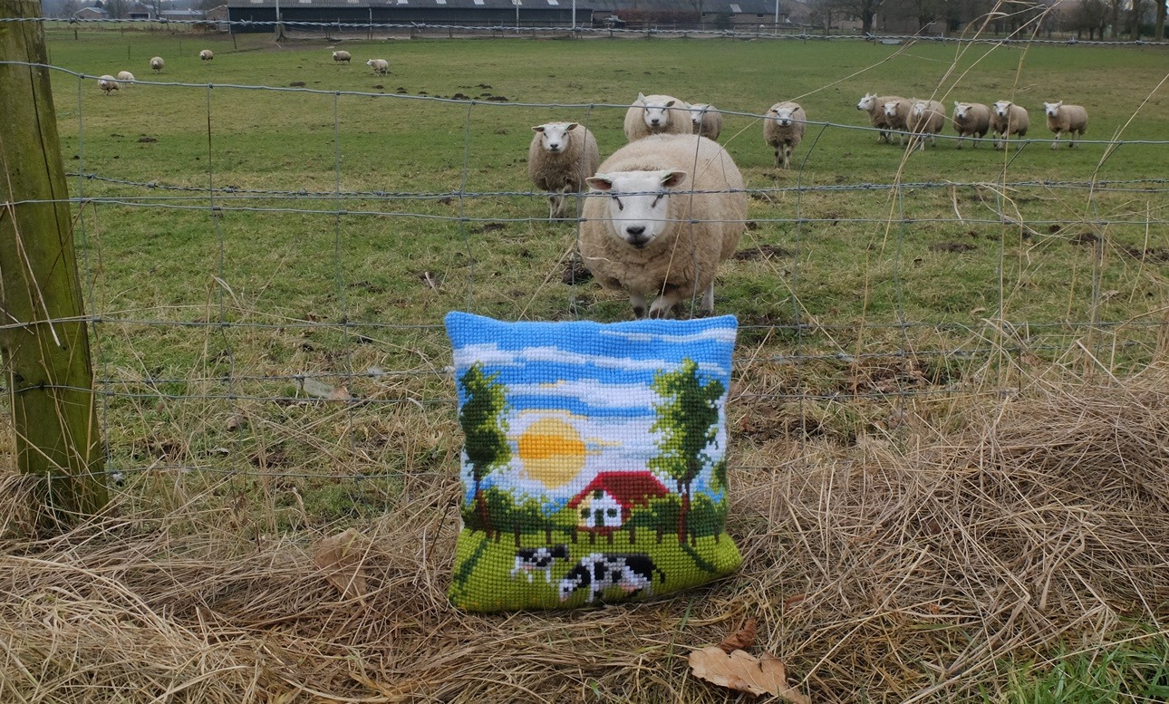 Een schaap was een paar dagen geleden nieuwsgierig naar wat ik aan het doen was. De dapperste kwam dichterbij en de kudde kwam erachteraan. Ik maakte een praatje: “Hallo schaap! Ik zocht eigenlijk een koe als achtergrond voor m’n kussen, maar die kan ik in februari nog niet vinden. Maar jij bent ook mooi.”