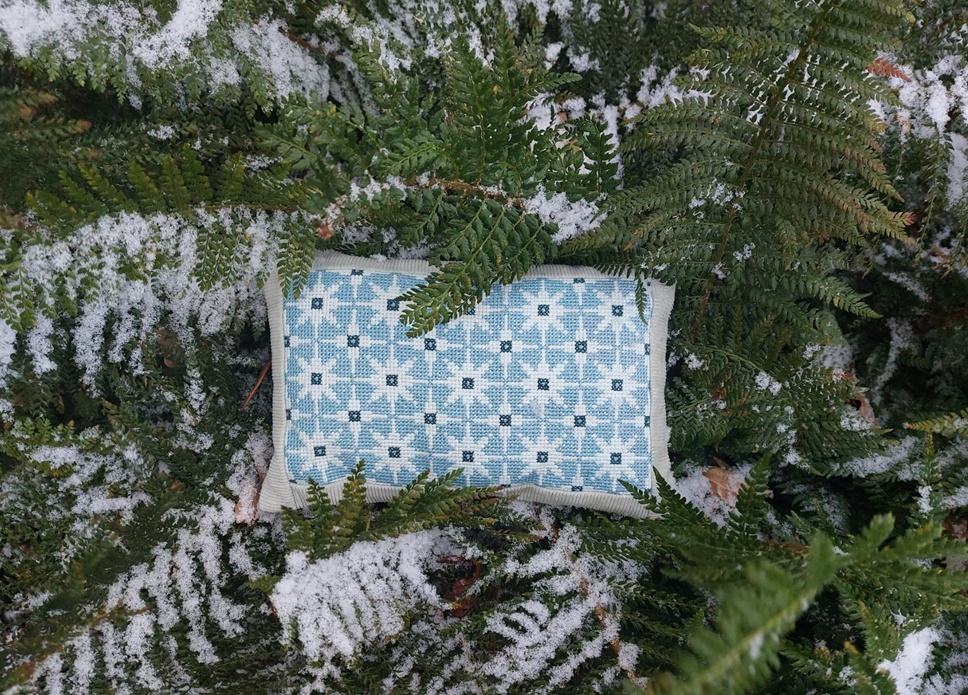 Het kussentje maakte ik lang geleden zelf, de sneeuw kwam vanmorgen vroeg uit de lucht vallen. Fijne zondag!