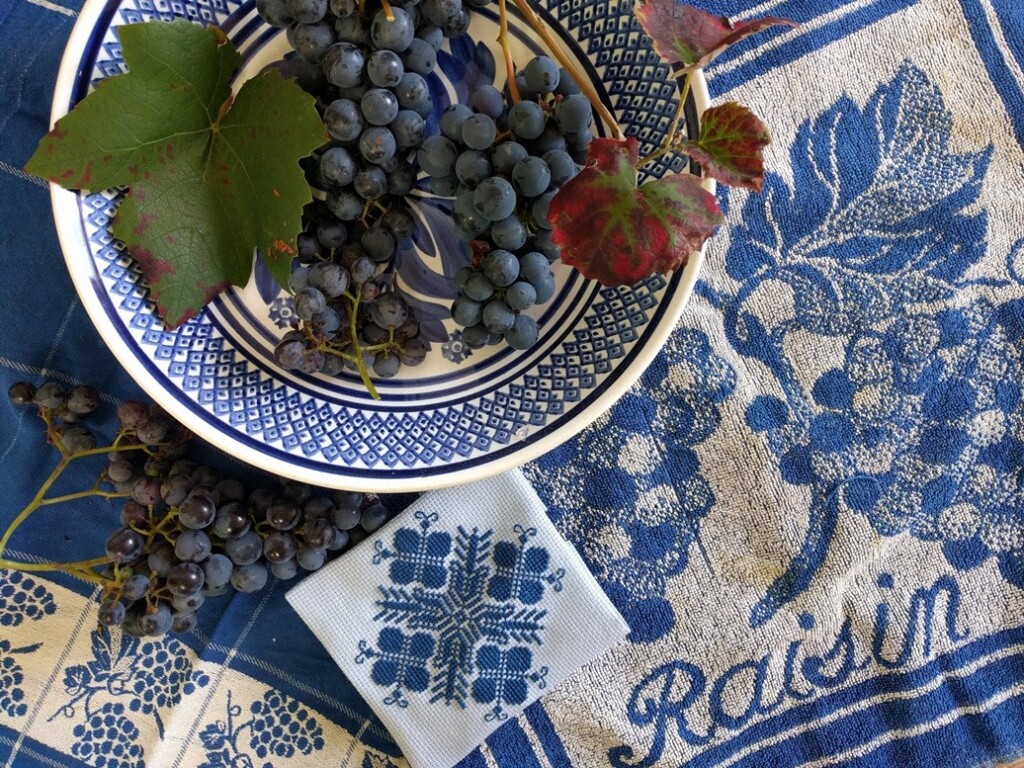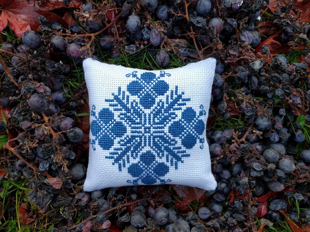 Actualiteit en lange doorlooptijd dus. De actualiteit is deze: er was nog een oud keukentrapje wat van m’n moeder was geweest en wat m’n zus nog een tijdje had gebruikt en nu niet meer nodig had. Nu heb ik het. Het trapje was precies hoog genoeg om bij nog wat druiven te komen die over de schutting groeien. De buren hebben er geen enkele belangstelling voor en de vogels wèl. Ze zijn bijna op. Vorig jaar had ik bij dit borduurwerkje een verhaaltje geschreven over twee keer druiven van de buren, en nu is met deze foto het zaakje rond. De druiven zijn vies, het seizoen is voorbij, een periode is afgesloten, het kussentje is af en een nieuwe zondag mag beginnen.