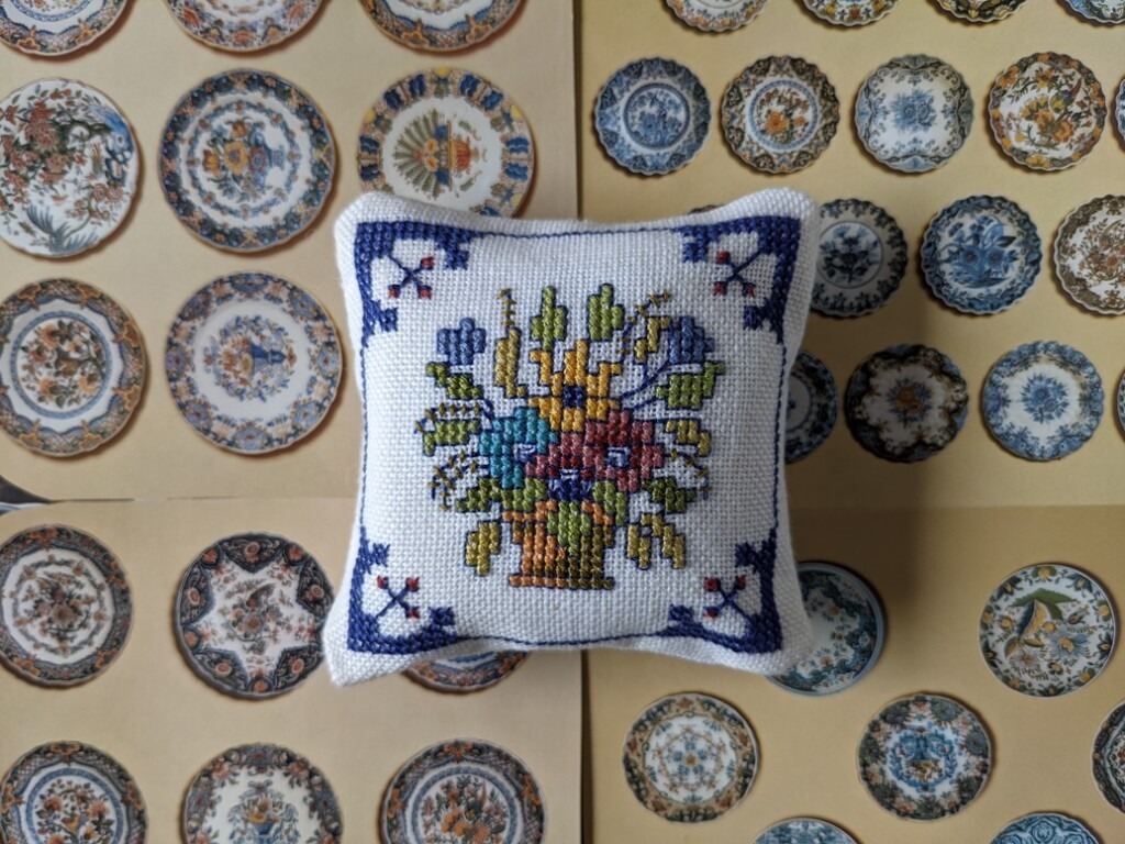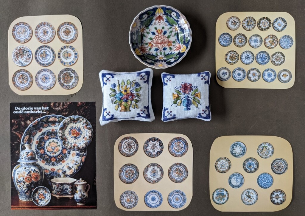 Dus nu heb ik twee kleine kussentjes die mooi passen bij het enige Makkumer-bordje in ons bezit. De plaatjes knipte ik uit een folder, waar ook nog wat prijzen bij stonden. Hm, dat is niet weinig! Borduren is goedkoper.