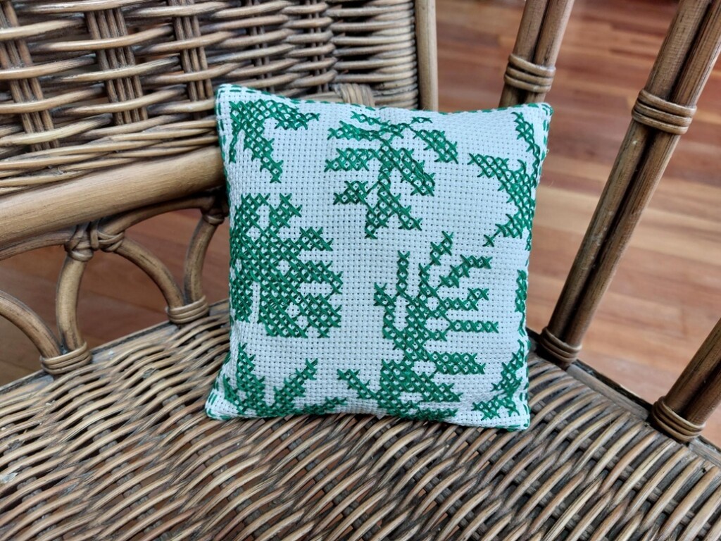 Zojuist een kussentje van gemaakt, en gefotografeerd in mijn lievelingsstoel, net als de foto van de cover. Het is de stoel die ik van mijn moeder erfde en waar ik vaak in zit te borduren. De liefde voor handwerken heb ik natuurlijk ook van mijn moeder geërfd….