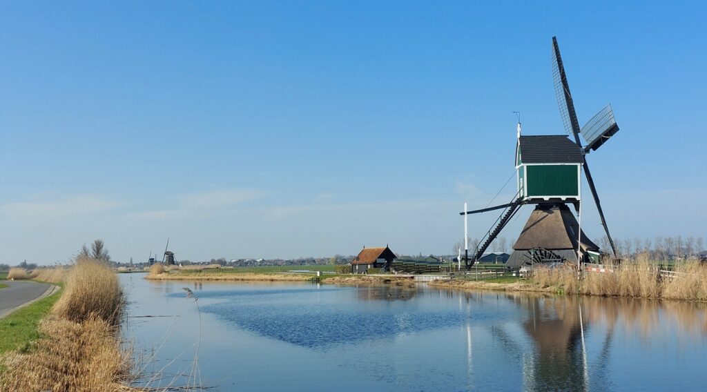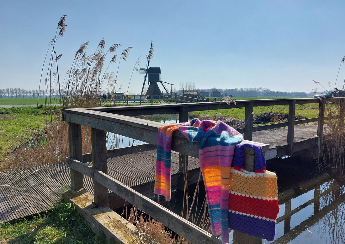 Op een stralende dag in maart reden we naar de Alblasserwaard voor een bezoek en een boodschap en daarna gingen we lekker toeren. ’s Morgens was het nog haast tegen het vriespunt en had je nog wel een sjaal nodig. Op zulke dagen hou ik ervan om iets vrolijks mee te nemen, zoals deze kleurrijke sjaal en een oud gehaakt tasje. Maar het warmde meer dan twintig graden op en algauw was die sjaal niet meer nodig. Hier, bij oud-Alblas, zaten we een uur op een picknickbankje te genieten van dotteberloemen en dartelende eenden.