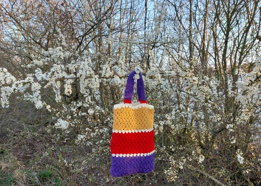Het hele jaar kijk ik niet om naar m’n oude gehaakte tasjes, maar in het vroege voorjaar vind ik deze weer leuk. Tussen de bloeiende Sleedoorn langs één van Neêrlands’ grote rivieren, dan is het ineens een tasje om te genieten van toegevoegde kleur aan het fantastische landschap!