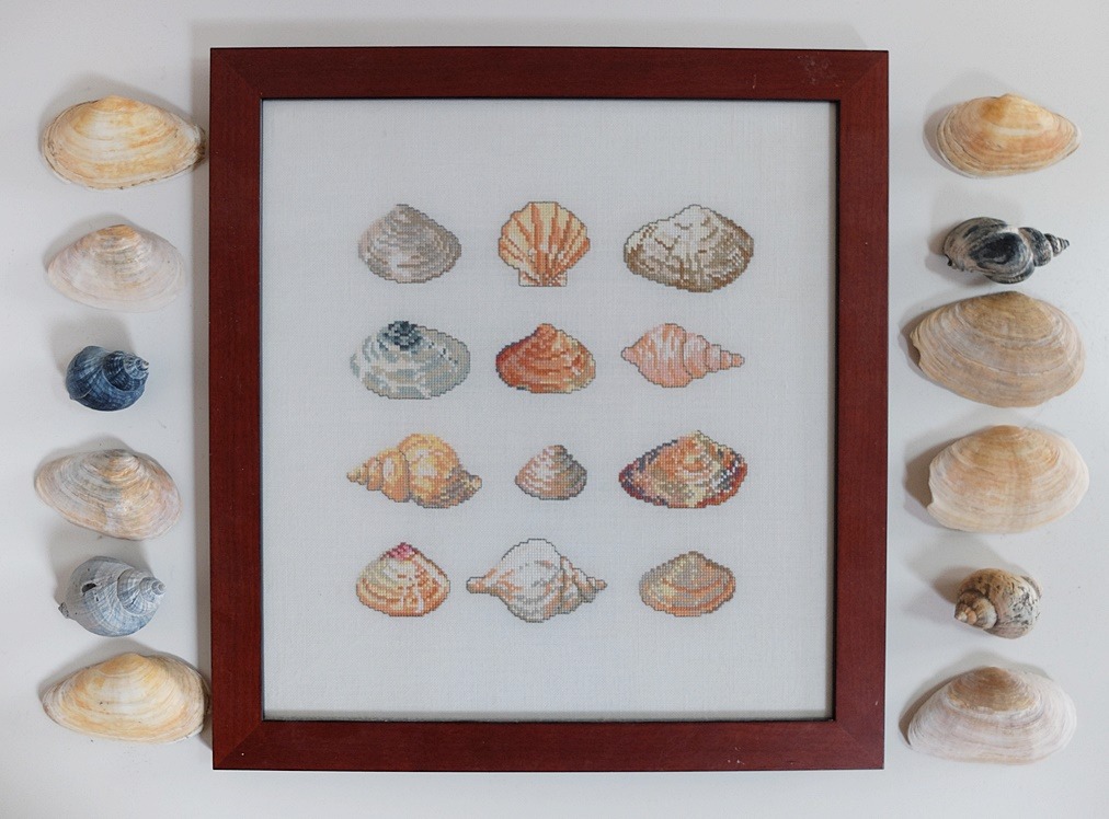 Dit fraaie geborduurde schilderij van schelpen plaats ik in m’n shop. Het staat heel mooi bij een schelpenverzameling.