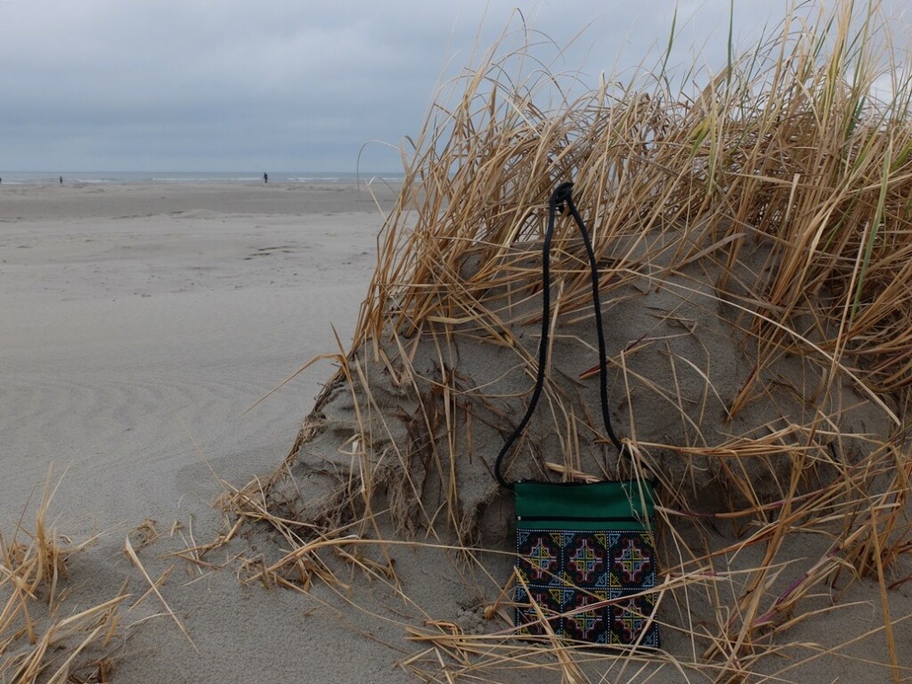 Dit tasje met Thaise motieven was niet aangespoeld, maar vorig jaar (o nee, nu moet ik zeggen: twee jaar geleden) door mij even neergelegd.