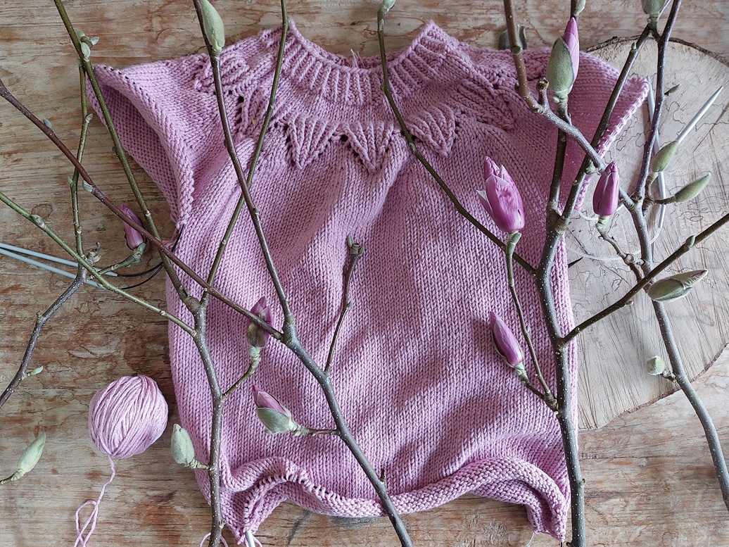 Je truitje is al weer bijna af! Het is een mooi kleurtje, wat goed past bij de magnolia bloemen!