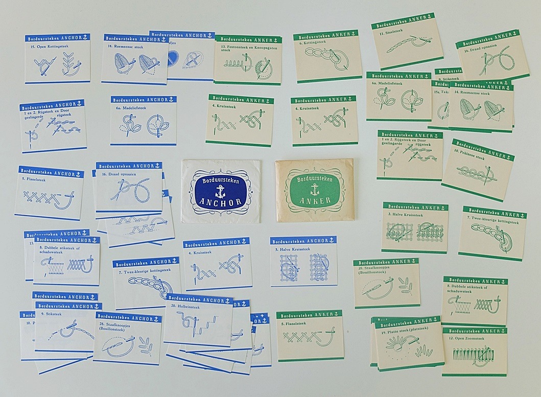 Vergelijking laat zien dat er behalve de kleur nog een verschil is. Het woord Anchor en Anker. Dit bedrijf was destijds een grote naam op het gebied van handwerk. De losse kaartjes in een mapje waren een groot succes (de moderne marketing vèr vooruit) en sommigen herkennen deze kaartjes nog wel van hun moeders of oma’s. Nu zijn ze verzamelaarsitems, of gewoon geschikt om opnieuw te gebruiken.
