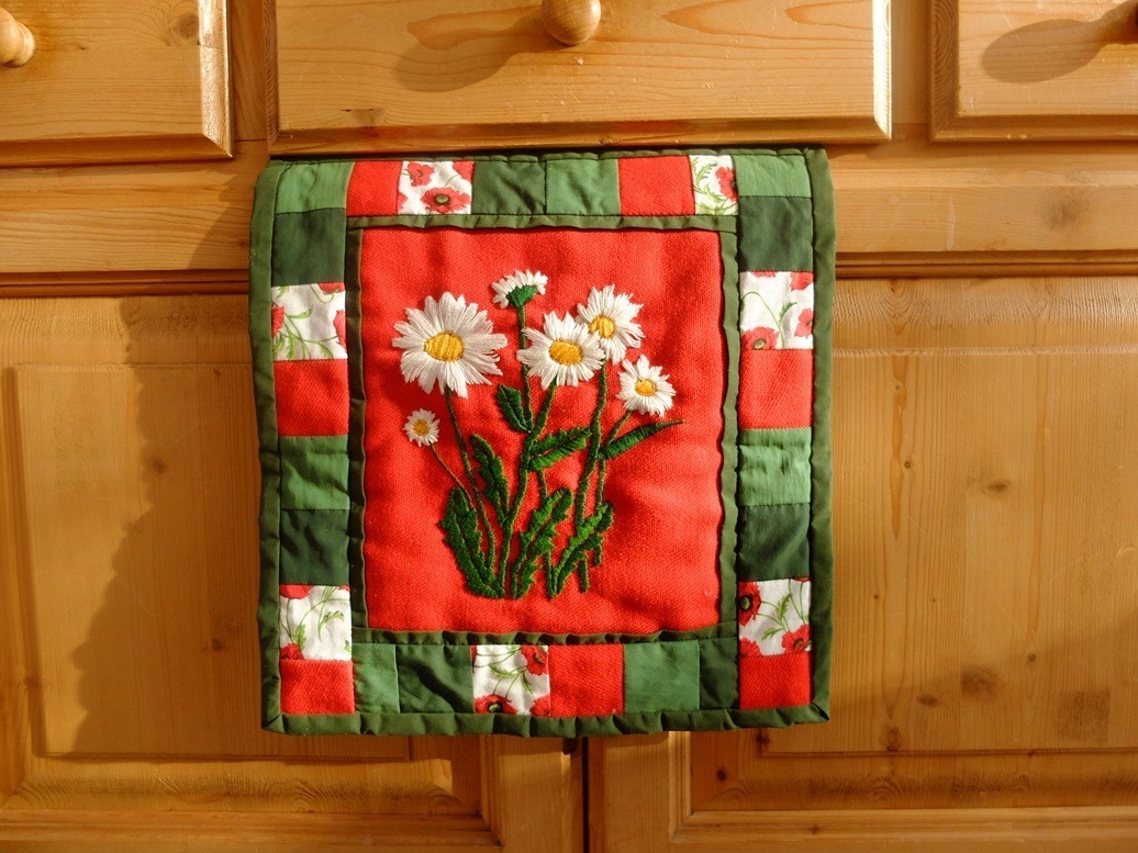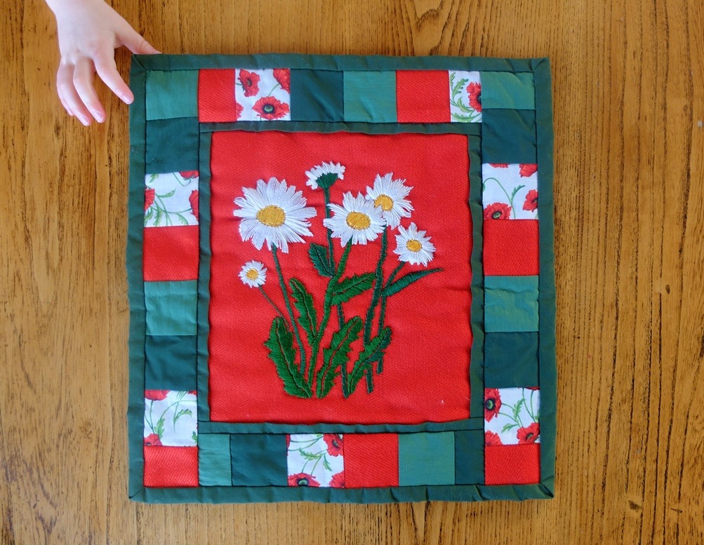 Een leuke manier om een oud borduurwerk (van jezelf of tweedehands) een opfrisbeurt te geven: naai er een rand van lapjes omheen! Dat deed m’n zus vroeger al eens en gister was ik bij haar op bezoek en zag haar leuke patchwork-dingetje liggen. Ik hing hem even in het zonnetje maar de foto werd niet naar m’n zin. Dan op tafel, en