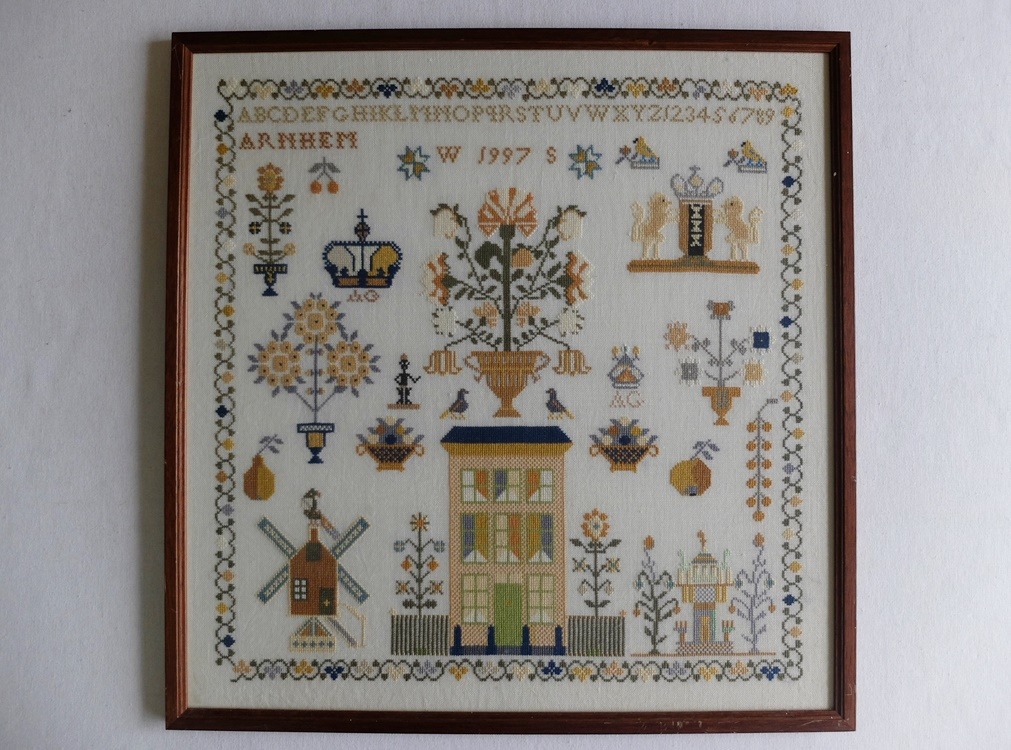 Een merklap uit 1997: dat is nog maar twintig jaar geleden. In de negentiger jaren stonden merklappen ook volop in de aandacht en verschenen veel patronen bij tijdschriften. Die kon je namaken, maar borduursters werden ook gestimuleerd om zelf wat te variëren en wat persoonlijke noten toe te voegen. Een merklap hoeft niet heel oud te zijn om een leuke aanwinst te zijn. Voor wie bijvoorbeeld een wandje vol wil hebben, met een combinatie van eigen geborduurde merklappen en een paar gekochte, kan dit een mooie aanvulling zijn.