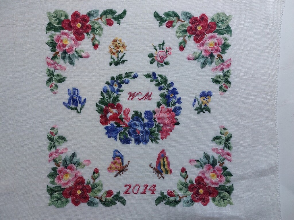 Tien jaar geleden alweer, dat 2014. Bloemen in de hoeken, een krans met bloemen in het midden, en de initialen van de maakster.