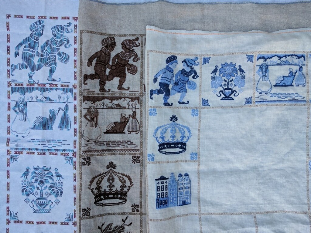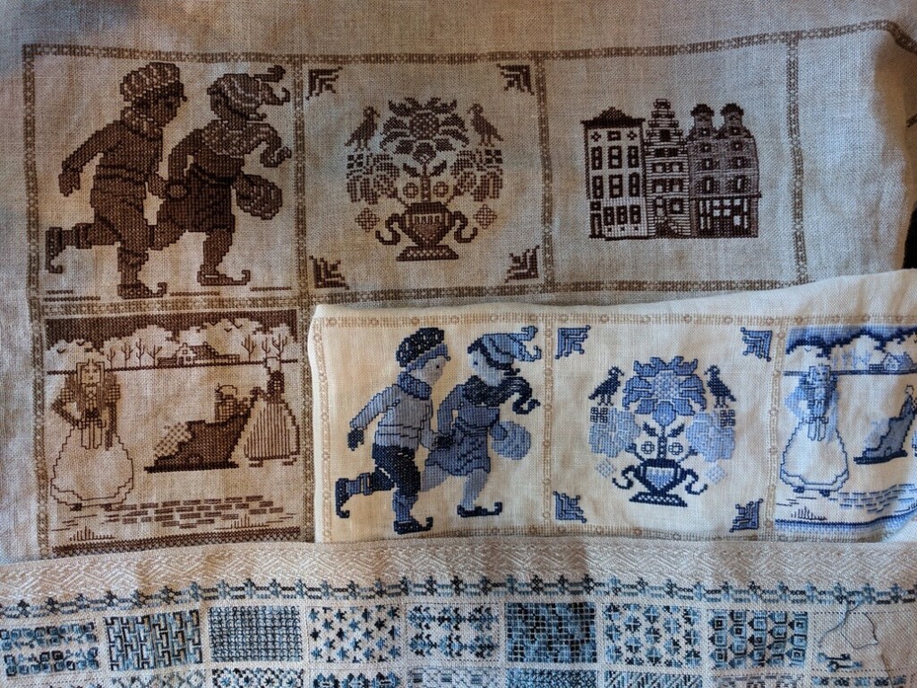 Alle handwerk-groepen en verenigingen publiceren tegenwoordig wekelijks of maandelijks patronen en als je besluit mee te doen dan weet je niet van te voren hoe het eruit gaat zien. Maar je weet wèl dat het leuk gaat worden en dat je via social media de vorderingen van jezelf kunt laten zien en de vorderingen van anderen kunt volgen. Het succes en het plezier van deze werkwijzen zijn groot! Ook de borduurvereniging Merkwaardig doet hier sinds drie jaar aan mee. Dit jaar wordt elke maand een oudhollands tegelmotief gepubliceerd. Op de ontmoetingsdagen nemen leden hun lappen mee en laten ze aan anderen zien. Ik liep langs iemand die net wat aan het showen was, en vroeg of ik haar lappen op de foto mocht zetten. Lia Howeling borduurt maar liefst twee lappen tegelijk: een bruine en een blauwe en ik hoorde haar vertellen dat paars ook een mooie kleur zou zijn voor deze geborduurde tegels. Terwijl ik bezig was met de foto, ontmoette ik Annie Witte, en zij borduurt met paradijsgaren. Deze twee foto’s geven een indruk van de vele mogelijkheden om mee te doen met het borduren van een aangereikt motief, en daarbij je eigen kleuren of invalshoek te kiezen. De instructies aan het begin van een nieuw project zijn altijd zodanig dat je weet dat de lap in vakken moet worden verdeeld. Wat er in het grote vak in het midden gaat komen is nog een verrassing.