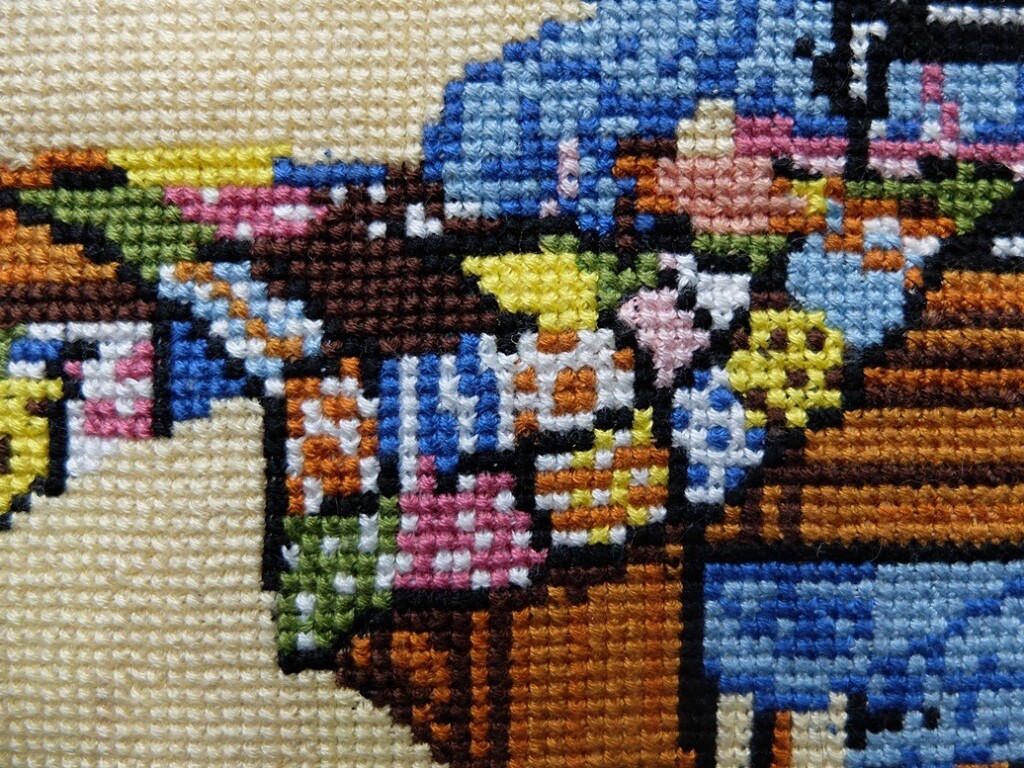 Schrale troost voor wie geen naaimachine heeft of al die lapjes teveel werk vindt: je kunt patchwork dus ook borduren. Net als miss Petticoat.