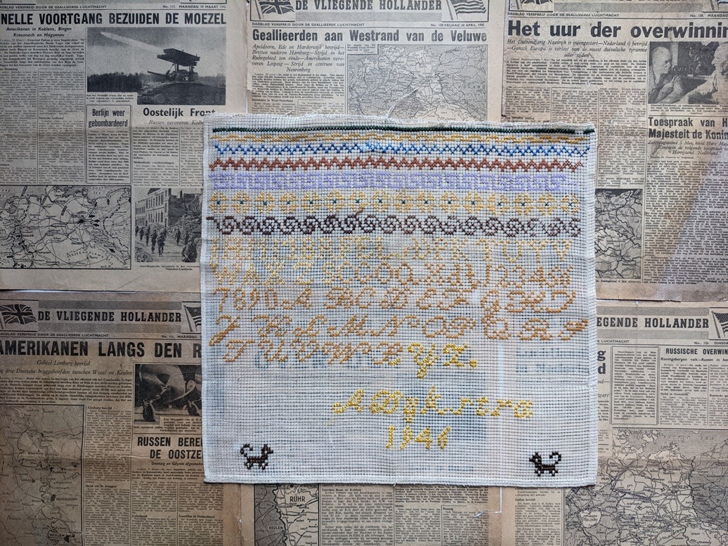En toen had ik ineens zelf iets in handen wat iets illustreert van die vele verhalen over herstel en opbouw. Een merklapje wat een meisje in 1946 maakte op haar school. Ik weet niet wie ze was, maar ik stel me voor dat ze blij was dat ze weer naar school kon. Het leven ging weer gewoon worden. Het onderwijs werd hervat. Iedereen werkte hard om dat allemaal mogelijk te maken. Zo is zo’n merklapje uit dat eerste na-de-oorlog-jaar een tastbaar bewijs van hoe iedereen weer aan het werk ging.