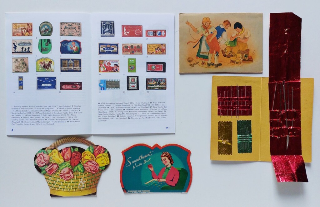 Ik legde het boekje open op de pagina van de papieren naaldenboekjes. En daar is van alles over te weten en dat maakt die nostalgische boekjes nog leuker. Het gebruik van spelden en naalden heeft een lange geschiedenis, en in de jaren dertig van de vorige eeuw werden de papieren boekjes met de mooie afbeeldingen gebruikt voor reclame. Ook over de speldenkussens, maasballen, naaldenkokers, knopenkaartjes, garenkaartjes en andere fournituren is van alles te lezen in het leuke kleine boekje wat ik nu in mijn shop plaats.
