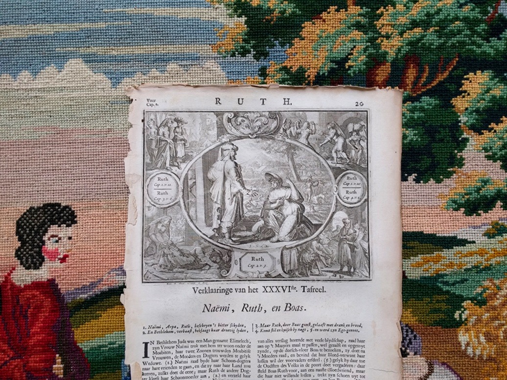 In de oude Bijbel die een paar dagen geleden mijn huis verliet, staan originele afdrukken van houtgravures. Sommige pagina’s zijn los (want die bijbel was ook al gedrukt in 1702!). Ik legde de afbeelding van Naëmi, Ruth en Boas op een oud borduurwerk. Dit borduuurwerk had ik een week eerder aan mijn bezoek laten zien. We keken er samen naar en verwonderden ons over de kleuren die zo goed bewaard zijn gebleven. Ruim een eeuw geleden werden veel grote borduurwerken gemaakt van bijbelse voorstellingen. Dit borduurwerk heb ik al een tijdje in huis, al vanaf het begin van mijn blog-bezigheden. Het is één van mijn mooiste borduurwerken, die ik koester.