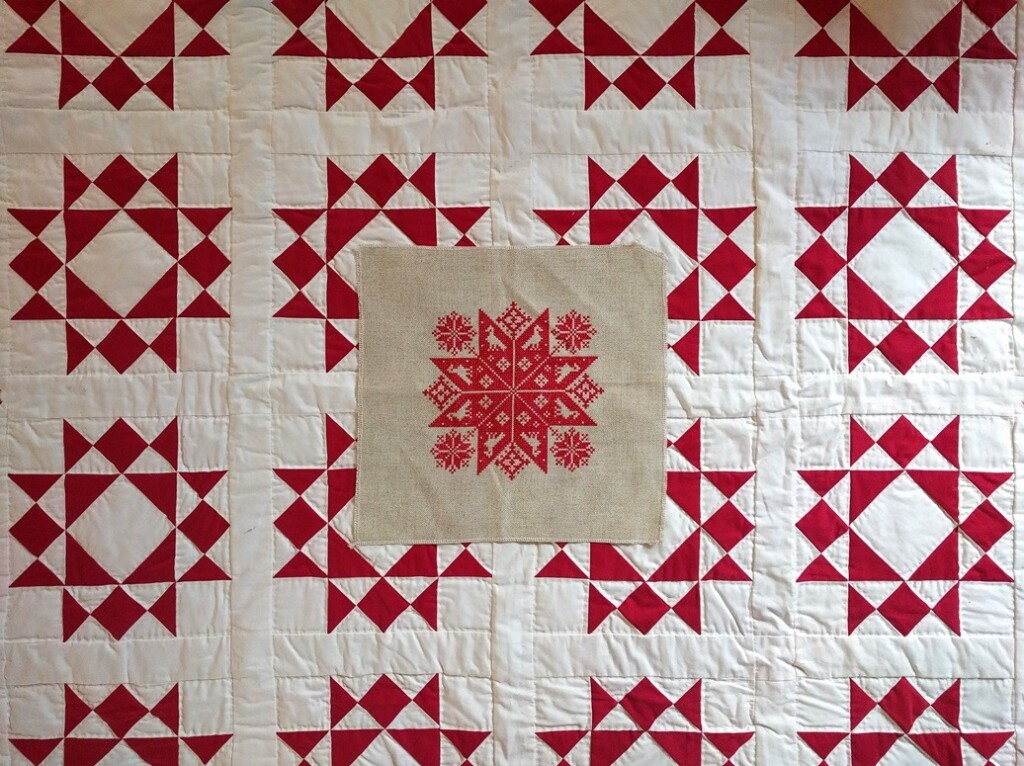Een paar keer liet ik op m’n blog zien dat ik bezig was om deze te borduren, zoals hier en hier. Zulke foto’s zijn leuk om de ontwikkeling van een borduurwerk te zien, maar ook om te zien hoe mooi en evenwichtig zo’n ster is opgebouwd.