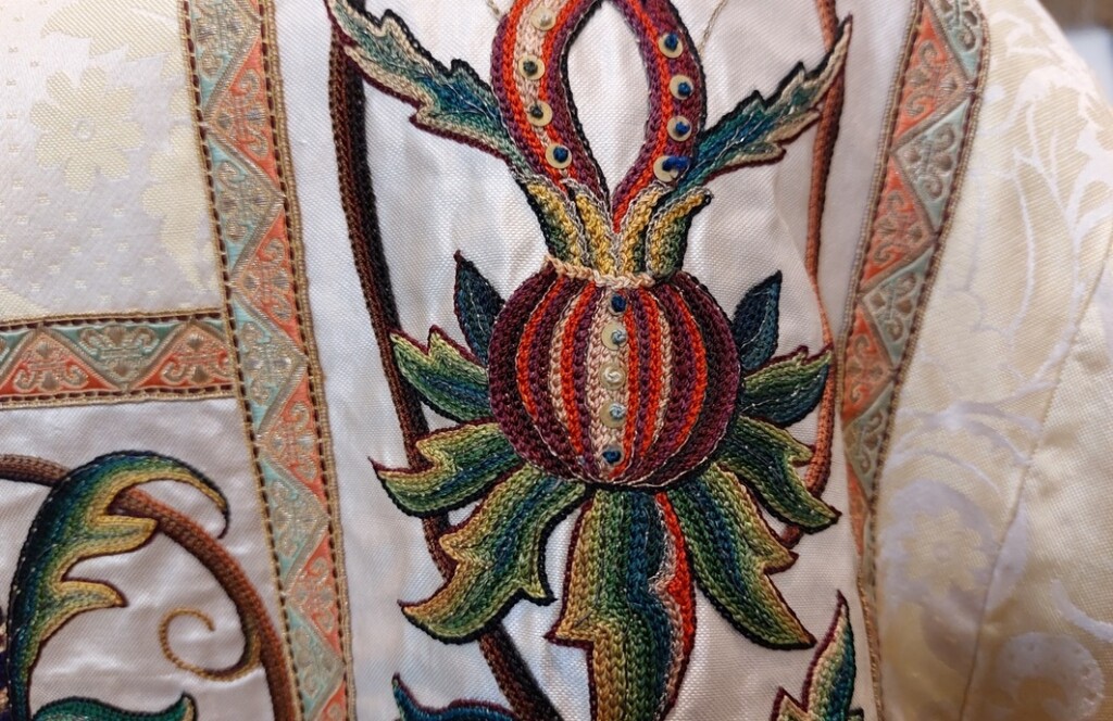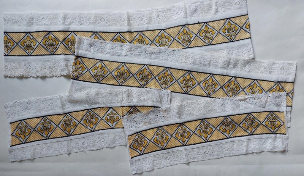 In dezelfde kerk werd ook wat oud liturgisch handwerk te koop aangeboden. Van sommige priesterkleding waren mobielhoesjes of tassen gemaakt: ook de kerk doet aan recycling. Deze stroken lagen te koop voor liefhebbers van mooi borduurwerk. Die neem ik wel mee, zei ik, voor m’n shop. En eigenlijk ook om er gewoon een blogje mee te kunnen maken. Oude gebouwen: sommige kunnen gerestaureerd worden en nieuwe bestemmingen krijgen, hoewel het veel mensen pijn doet dat de oorspronkelijke bestemming niet behouden kan blijven. Oud textiel: eigenlijk hetzelfde. Maar het is zoals het is. En via foto’s (op blogjes en in boeken) kun je nog eens laten zien hoe het was toen het (vroeger) was.