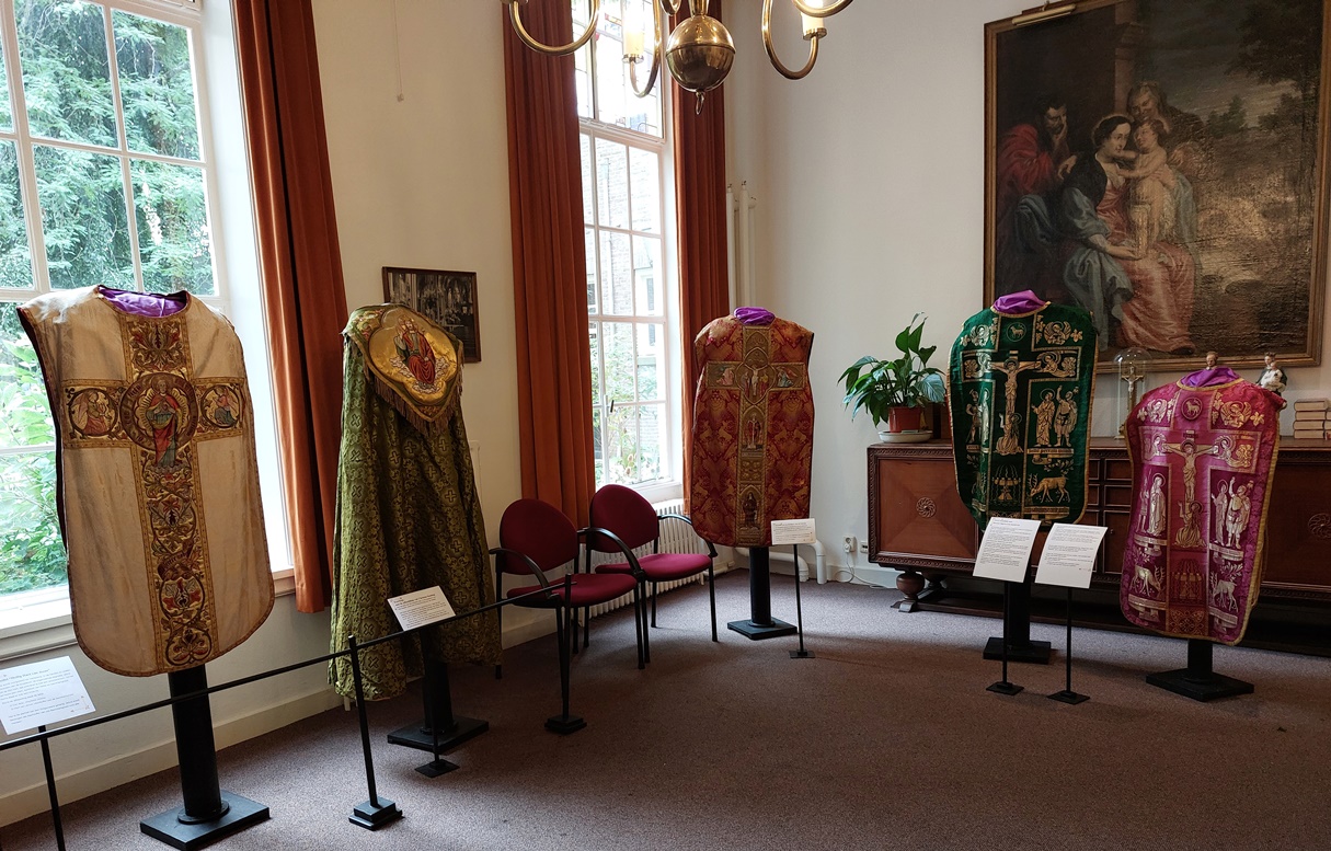 En er is op zo’n dag ook ‘eerbied voor textiel’ te vinden, in sommige gebouwen. Na de tentoonstelling over Eleonora werd ik uitgenodigd om via de eenmalig opengestelde oude kloostertuin nog een zijgebouw van de Broederenkerk te bezoeken. Hier waren oude kazuifels tentoongesteld. Sommige gaan gerestaureerd worden.