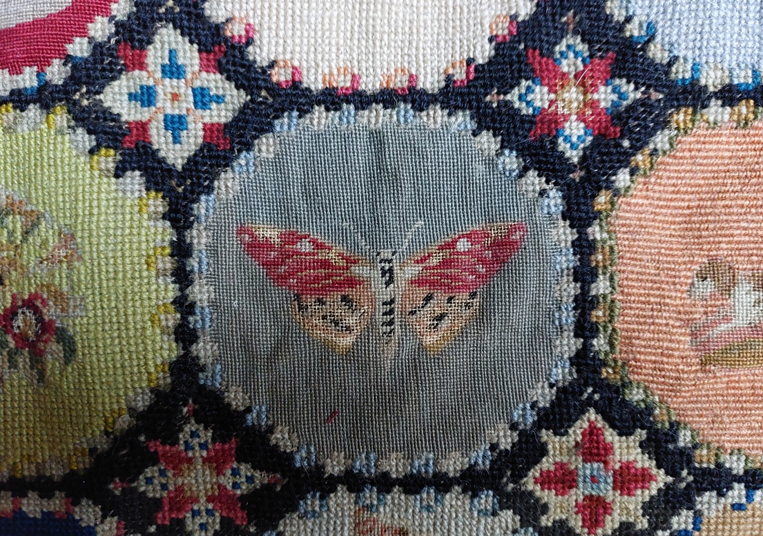 De onderwerpen die in de Biedemeiertijd volop voorkwamen, zijn op deze lap terug te zien.