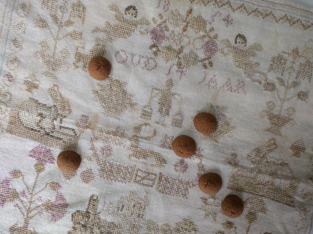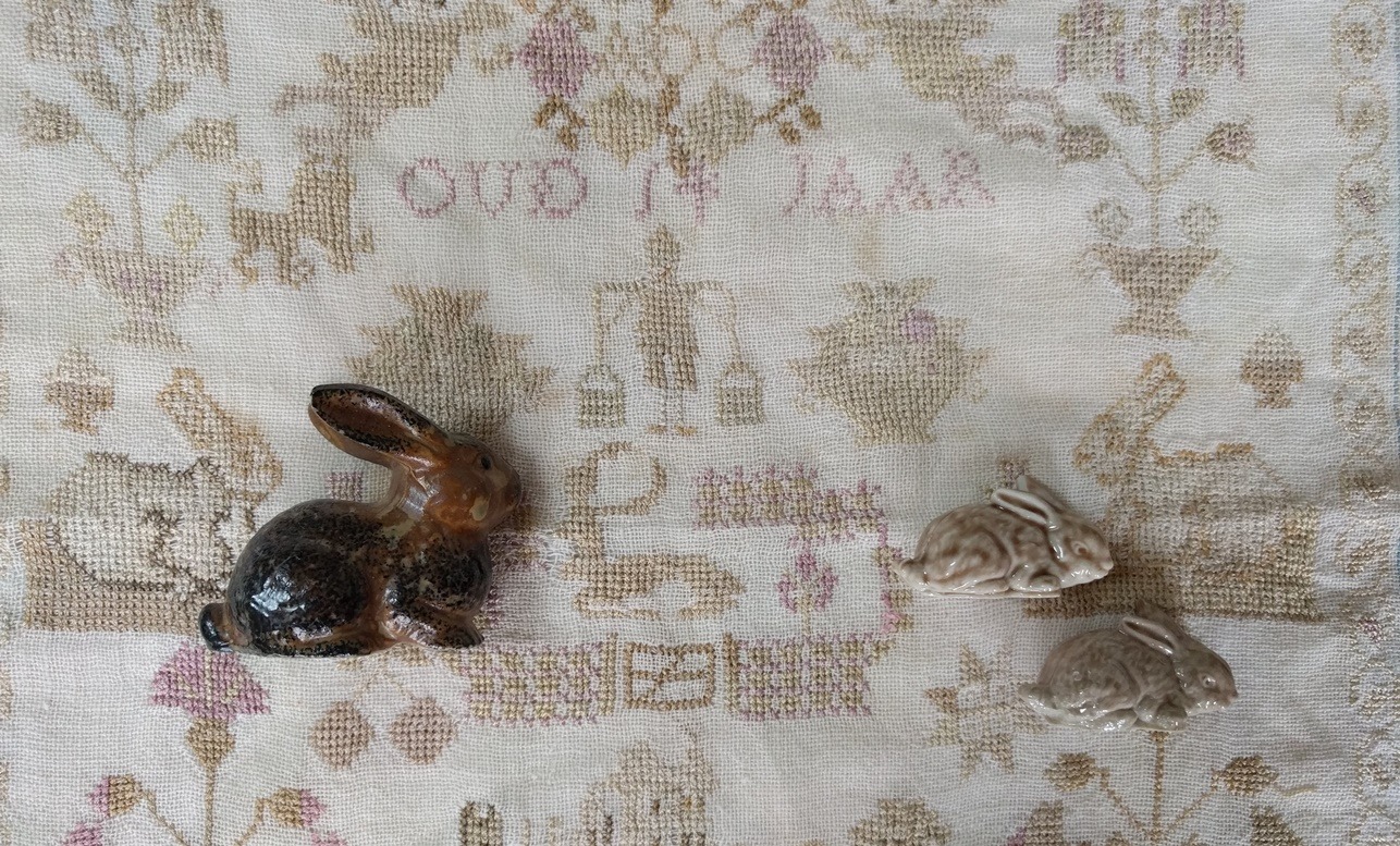 “Maar er gaat hier niks het huis uit zonder een foto”, zei ik, dus legde ik het lapje eerst nog even op tafel. Daar stond (om in de sfeer van vandaag te komen) een schaaltje kruidnoten. Ik keek nog even verder om me heen, en zag de konijntjes. Veel beter! Dit lapje vond ik zelf ook een schatje, juist vanwege die konijntjes. Maar ik ben helemaal blij dat dit mooie lapje nu met een liefhebber mee naar Engeland gaat. Ze gaat het laten inlijsten. Gemaakt in achttien-vier-en-vijftig…. bijzonder toch?