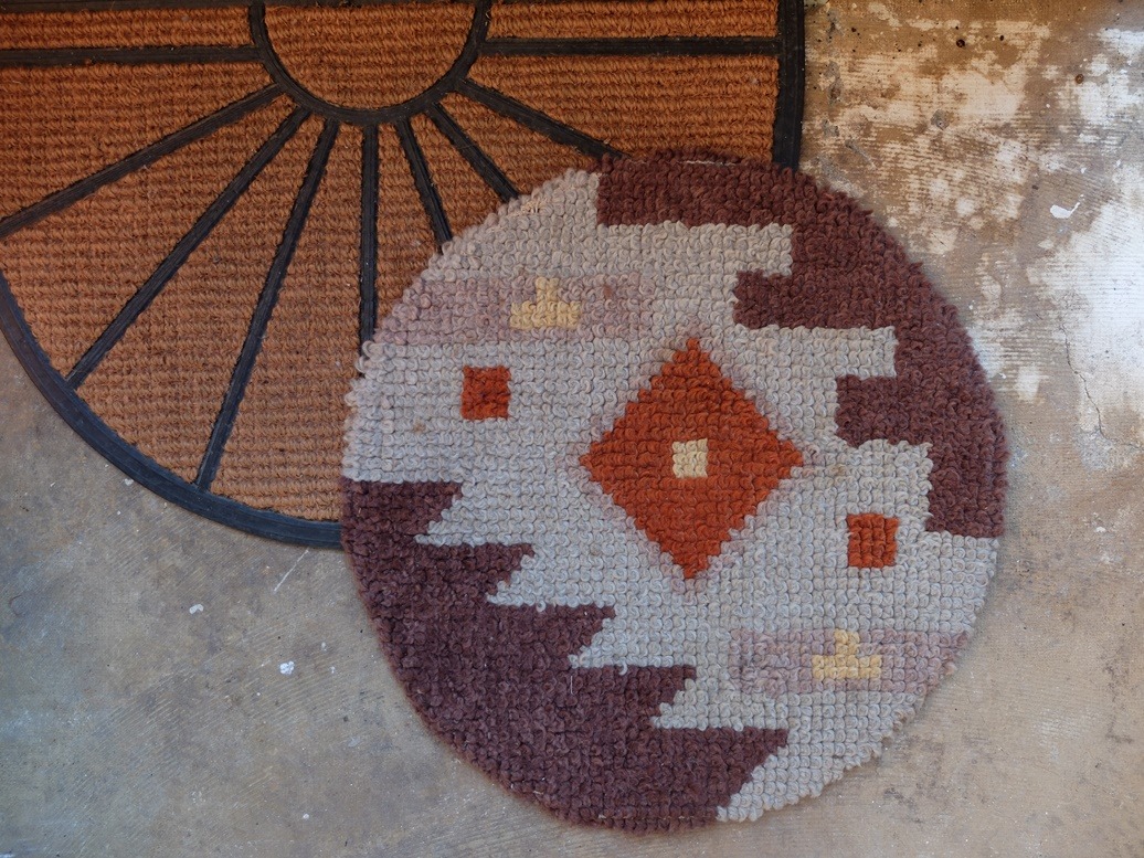 het bij een deurmat die weliswaar ook wat krachtige lijnen heeft, maar die halen het niet bij de lijnen van het oude ronde smyrna-kleedje. Ik wil nog navragen bij m’n moeder of zij herinnert of háár moeder het misschien heeft gemaakt? Dan is het een oud familiekleedje en kan het misschien nòg wel een aantal jaren gebruikt worden.